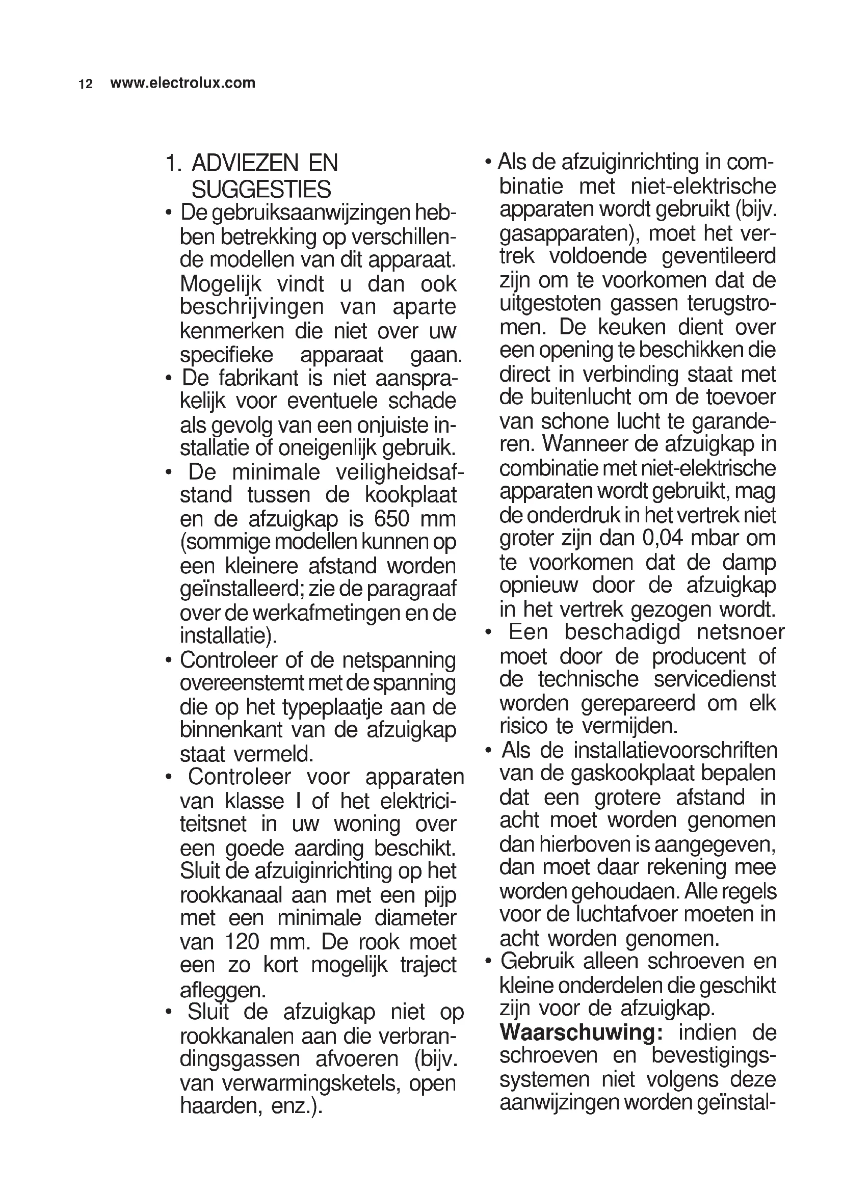 - Als de afzuiginrichting in com- binatie met niet-elektrische apparaten wordt gebruikt (bijv. gasapparaten), moet het ver- trek voldoende geventileerd zijn om te voorkomen dat de uitgestoten gassen terugstro- men. De keuken dient over een opening te beschikken die direct in verbinding staat met de buitenlucht om de toevoer van schone lucht te garande- ren. Wanneer de afzuigkap in combinatie met niet-elektrische apparaten wordt gebruikt, mag de onderdruk in het vertrek niet groter zijn dan 0,04 mbar om te voorkomen dat de damp opnieuw door de afzuigkap in het vertrek gezogen wordt.