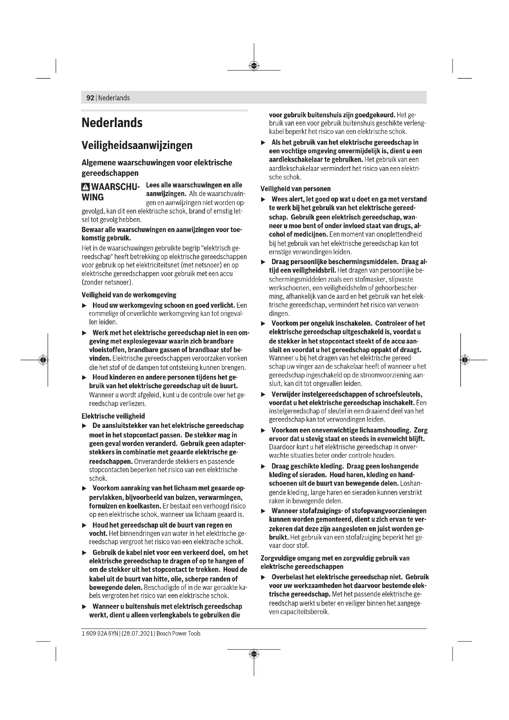 u Neem vóór alle werkzaamheden aan het elektrische gereedschap (zoals het uitvoeren van onderhoud of het wisselen van inzetgereedschappen e.d.) en vóór het vervoeren en opbergen altijd de accu uit het elek- trische gereedschap. Bij per ongeluk bedienen van de aan/uit-schakelaar bestaat gevaar voor letsel. U kunt de machinekop in stappen van 90° draaien. Daardoor kan de aan-/uit- schakelaar voor bijzondere toepassingen in een gunsti- gere bedieningspositie ge- bracht worden, bijv. voor linkshandigen. Draai de 4 schroeven er he- lemaal uit. Draai de machi- nekop voorzichtig en zonder deze van de behuizing te ne- men in de nieuwe positie. Draai de 4 schroeven weer vast. Afzuiging van stof en spanen Stof van materialen zoals loodhoudende verf, enkele hout- soorten, mineralen en metaal kunnen schadelijk voor de ge- zondheid zijn. Aanraking of inademing van stof kan leiden tot allergische reacties en/of ziekten van de luchtwegen van de gebruiker of personen die zich in de omgeving bevinden. Bepaalde soorten stof, bijvoorbeeld van eiken- en beuken- hout, gelden als kankerverwekkend, in het bijzonder in com- binatie met toevoegingsstoffen voor houtbehandeling (chro- maat en houtbeschermingsmiddelen). Asbesthoudend ma- teriaal mag alleen door bepaalde vakmensen worden be- werkt. – Zorg voor een goede ventilatie van de werkplek. – Er wordt geadviseerd om een stofmasker met filterklasse P2 te dragen. Neem de in uw land geldende voorschriften voor de te be- werken materialen in acht. u Vermijd ophoping van stof op de werkplek. Stof kan gemakkelijk ontbranden. Gebruik Ingebruikname Accu plaatsen Schuif de opgeladen accu (8) vanaf de voorkant in de voet van het elektrische gereedschap tot de accu veilig vergren- deld is. In- en uitschakelen Schuif voor de ingebruikname van het elektrische gereed- schap de aan/uit-schakelaar (6) naar voren. Voor het vastzetten van de aan/uit-schakelaar (6) duwt u de aan/uit-schakelaar (6) aan de voorkant omlaag tot deze vast- klikt. Om het elektrische gereedschap uit te schakelen laat u de aan/uit-schakelaar (6) los of wanneer deze vergrendeld is, 1 609 92A 6YN | (28.07.2021) Bosch Power ToolsNederlands | 103 duwt u de aan/uit-schakelaar (6) kort achter omlaag en laat deze dan los. u Controleer de slijpgereedschappen vóór gebruik. Het slijpgereedschap moet correct gemonteerd zijn en vrij kunnen draaien. Laat dit ten minste 1 minuut zonder belasting proefdraaien. Gebruik geen beschadigde, onronde of trillende slijpgereedschappen. Beschadig- de slijpgereedschappen kunnen barsten en verwondingen veroorzaken. Terugslaguitschakeling Bij een plotselinge terugslag van het elektri- sche gereedschap, bijv. blokkeren bij doorslij- pen, wordt de stroomtoevoer naar de motor elektronisch onderbroken. Daarbij knippert de LED-werklamp (4) wit en de aanduiding Status (32) rood. Voor de hernieuwde ingebruikname zet u de aan/uit-schake- laar (6) in de uitgeschakelde stand en schakelt u het gereed- schap opnieuw in. Nulspanningsbeveiliging De nulspanningsbeveiliging voorkomt ongecontroleerd star- ten van het elektrische gereedschap na een onderbreking van de stroomtoevoer. Bij geactiveerde nulspanningsbeveiliging knippert de aandui- ding Status (32) rood. Voor de hernieuwde ingebruikname zet u de aan/uit-scha- kelaar (6) in de uitgeschakelde stand en schakelt u het elek- trische gereedschap opnieuw in. Valuitschakeling De geïntegreerde valuitschakeling schakelt het elektrische gereedschap uit, zodra het na een val op de bodem terecht- komt. Daarbij knippert de aanduiding Status (32) rood. Voor de hernieuwde ingebruikname zet u de aan/uit-schakelaar (6) in de uitgeschakelde stand en schakelt u het elektrische gereedschap opnieuw in. Gebruikersinterface (zie afbeelding B) De gebruikersinterface (5) dient voor het instellen van het toerental en voor het aanduiden van de toestand van het elektrische gereedschap. Toerentalinstelling