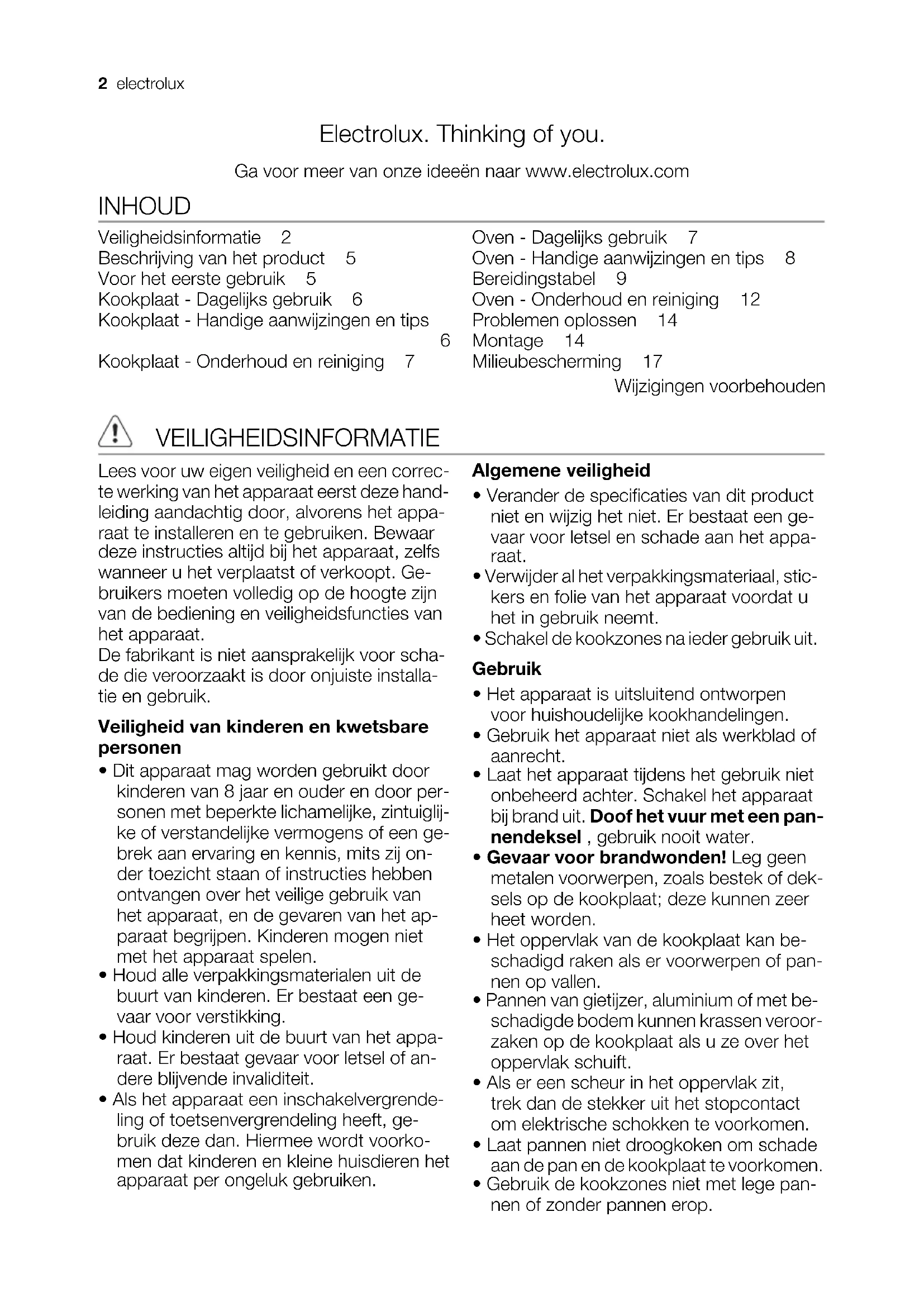 gebruiksaanwijzing user manual notice d'utilisation benutzerinformation Fornuis Cooker Cuisinière Herd EKK601305 BEElectrolux. Thinking of you. Ga voor meer van onze ideeën naar www.electrolux.com INHOUD Veiligheidsinformatie 2 Beschrijving van het product 5 Voor het eerste gebruik 5 Kookplaat - Dagelijks gebruik 6 Kookplaat - Handige aanwijzingen en tips