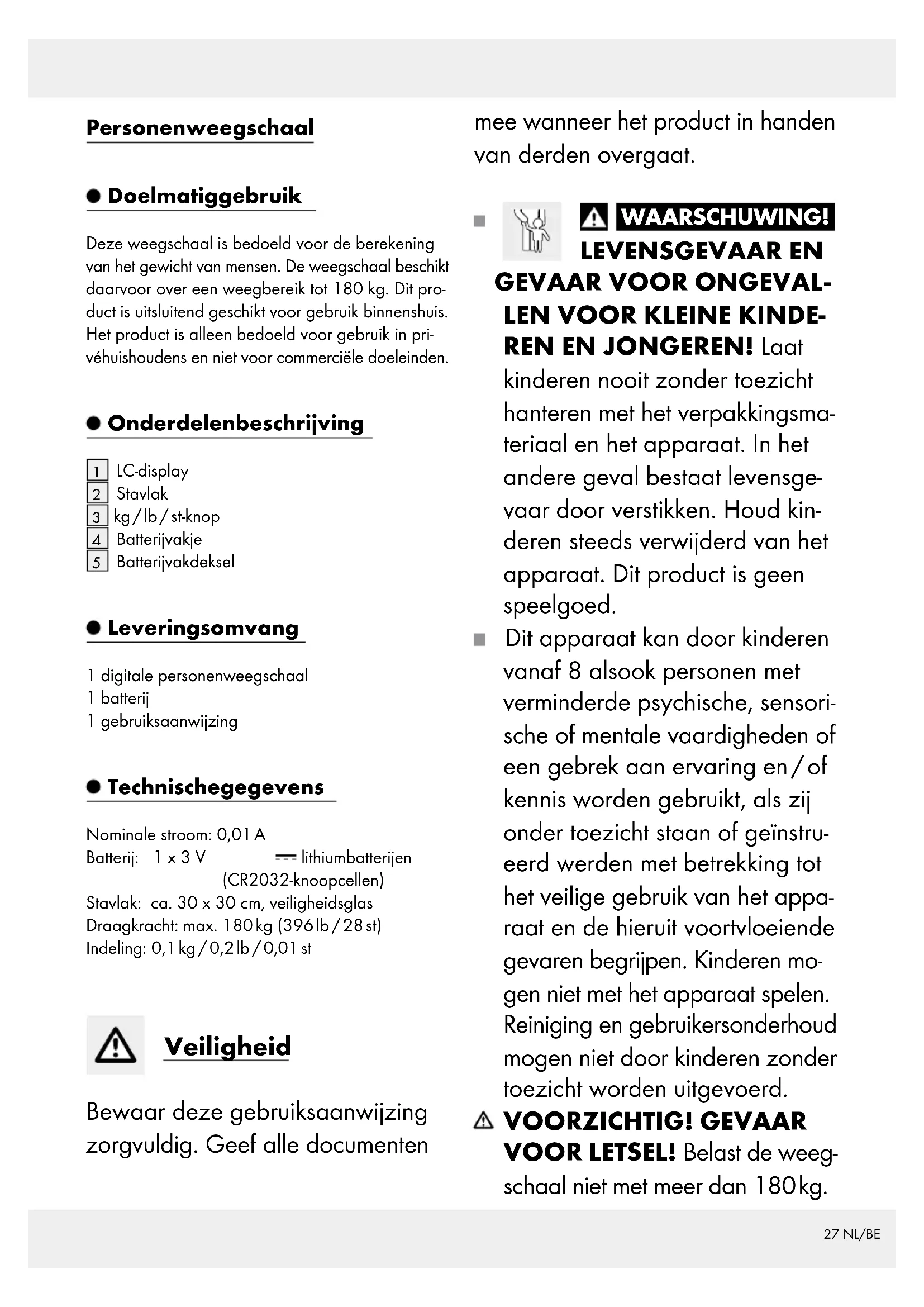 Batterijvakdeksel Leveringsomvang 1 digitale personenweegschaal 1 batterij 1 gebruiksaanwijzing Technische gegevens Nominale stroom: 0,01 A Batterij: 1 x 3 V lithiumbatterijen (CR2032-knoopcellen) Stavlak: ca. 30 x 30 cm, veiligheidsglas Draagkracht: max. 180 kg (396 lb / 28 st) Indeling: 0,1 kg / 0,2 lb / 0,01 st Veiligheid Bewaar deze gebruiksaanwijzing zorgvuldig. Geef alle documenten mee wanneer het product in handen van derden overgaat. WAARSCHUWING! LEVENSGEVAAR EN