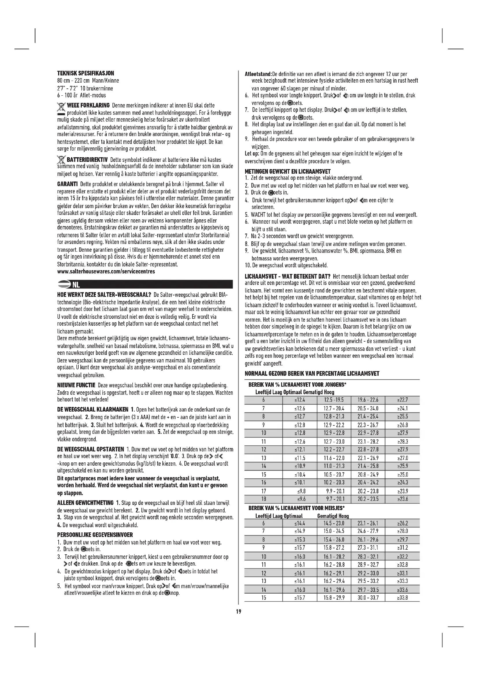 Hoe worden mijn lichaamsvet en water precies gemeten? Deze Salter-weegschaal gebruikt een meetmethode die Bio-elektrische Impedantie Analyse (BIA) wordt genoemd. Via uw voeten en benen wordt een uiterst lichte21 stroomstoot door uw lichaam gevoerd. Dit stroompje gaat gemakkelijk door mager spierweefsel, dat een hoog vloeistofgehalte heeft, maar niet gemakkelijk door vet. Door de impedantie (d.w.z. de weerstand van het stroompje) te meten, kan de hoeveelheid spieren worden vastgesteld. Hieruit kan de hoeveelheid vet en water worden berekend. Wat is de waarde van het stroompje dat door mij heengaat als de meting plaatsvindt? Is het veilig? Het stroompje is minder dan 1 mA, wat heel weinig is en volkomen veilig. U kunt het niet voelen. U moet er echter wel om denken dat u dit apparaat niet mag gebruiken als u een intern elektronisch medisch apparaat draagt, zoals een pacemaker. Dit uit voorzorg tegen een mogelijke verstoring van dat apparaat. Als ik mijn lichaamsvet en water op verschillende momenten van de dag meet, kan er behoorlijk veel verschil in zitten. Welke waarde is correct? De meting van uw lichaamsvetpercentage varieert naar gelang de hoeveelheid lichaamswater, en deze verandert gedurende de dag. Er is geen goed of fout moment van de dag om een meting te doen, maar probeer wel vaste tijden aan te houden en kies een moment waarop de waterhuishouding van uw lichaam naar uw mening normaal is. Doe geen metingen nadat u een bad of sauna hebt genomen, nadat u intensief getraind hebt of binnen 1-2 uur nadat u veel gedronken hebt of een maaltijd hebt genuttigd. Een kennis van mij heeft een lichaamsvetanalysator van een ander merk. Toen ik deze gebruikte, kreeg ik een andere lichaamsvetwaarde. Hoe kan dit? De verschillende apparaten voor lichaamsvetanalyse doen metingen op verschillende delen van het lichaam en gebruiken verschillende wiskundige algoritmes om het percentage lichaamsvet te berekenen. Het beste advies is om geen vergelijkingen tussen apparaten te maken, maar altijd hetzelfde apparaat te gebruiken, zodat u een goed beeld krijgt van de veranderingen. Hoe moet ik de metingen van mijn lichaamsvet en waterpercentage interpreteren? Raadpleeg de tabellen Lichaamsvet en Water die bij dit product horen. Hier kunt u aflezen of uw lichaamsvet en watermetingen binnen een gezonde categorie vallen (in relatie tot uw leeftijd en geslacht). Waarom zijn de niveaus voor lichaamsvetpercentages zo verschillend voor mannen en vrouwen? Vrouwen hebben van nature een hoger vetpercentage dan mannen, omdat hun lichaam anders gebouwd is in verband met zwangerschap, borstvoeding, etc. Wat moet ik doen als mijn waterpercentagemeting ‘laag’ is? Zorg ervoor dat u regelmatig voldoende water drinkt en doe uw best om uw vetpercentage naar een gezond niveau te krijgen. Waarom moet ik het gebruik van de lichaamsvet analysator vermijden tijdens zwangerschap? Tijdens de zwangerschap verandert de samenstelling van het lichaam van de vrouw sterk, omdat het moet zorgen voor het zich ontwikkelende kind. Onder dergelijke omstandigheden kunnen metingen van lichaamsvetpercentages onnauwkeurig en misleidend zijn. Zwangere vrouwen dienen daarom alleen de gewichtfunctie te gebruiken. ADVIES VOOR GEBRUIK EN ONDERHOUD • Zet bij het wegen dezelfde weegschaal altijd op dezelfde plaats op de vloer.Vergelijk geen meetwaarden van verschillende weegschalen, aangezien er verschillen ontstaan door het fabricageproces. • Plaats de weegschaal op een harde, vlakke vloer voor de grootste nauwkeurigheid en herhaalbaarheid van de meting. • Het wordt aangeraden de meting steeds te doen op hetzelfde moment van de dag, bij voorkeur in de vroege avond voor de maaltijd, voor de meest constante resultaten. • De weegschaal rondt naar de eerstvolgende stap naar boven of beneden af. Indien u zichzelf tweemaal weegt en u krijgt twee verschillende resultaten, dan ligt uw gewicht er tussenin. • Reinig de weegschaal met een vochtige doek. Gebruik geen chemische reinigingsmiddelen. • Er mag geen water in de weegschaal dringen, omdat hierdoor de elektronica beschadigd kan raken. • Behandel de weegschaal voorzichtig; het is een precisie-instrument. Laat de weegschaal niet vallen en spring er niet op. PROBLEMEN OPLOSSEN • U dient de metingen voor lichaamsvet en totaal lichaamswater blootsvoets uit te voeren. • De conditie van de huid onder uw voeten kan van invloed zijn op de meting. Om de meest precieze en constante resultaten te bereiken, dient u uw voeten af te vegen met een vochtig doek, zodat ze licht vochtig zijn voordat u op de weegschaal stapt. WAARSCHUWINGSMELDINGEN Lo Batterij vervangen. O-Ld Gewicht is zwaarder dan maximale capaciteit. Err2 Valt buiten bereik, onjuiste handeling of slecht voetcontact. TECHNISCHE SPECIFICATIE 80 cm - 220 cm Man/Vrouw 2’7” - 7’2” Geheugen voor 10 gebruikers