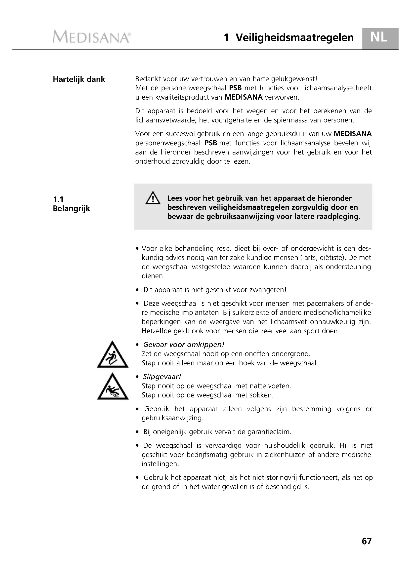 Belangrijk Bedankt voor uw vertrouwen en van harte gelukgewenst! Met de personenweegschaal PSB met functies voor lichaamsanalyse heeft u een kwaliteitsproduct van MEDISANA verworven. Dit apparaat is bedoeld voor het wegen en voor het berekenen van de lichaamsvetwaarde, het vochtgehalte en de spiermassa van personen. Voor een succesvol gebruik en een lange gebruiksduur van uw MEDISANA personenweegschaal PSB met functies voor lichaamsanalyse bevelen wij aan de hieronder beschreven aanwijzingen voor het gebruik en voor het onderhoud zorgvuldig door te lezen. Lees voor het gebruik van het apparaat de hieronder beschreven veiligheidsmaatregelen zorgvuldig door en bewaar de gebruiksaanwijzing voor latere raadpleging.