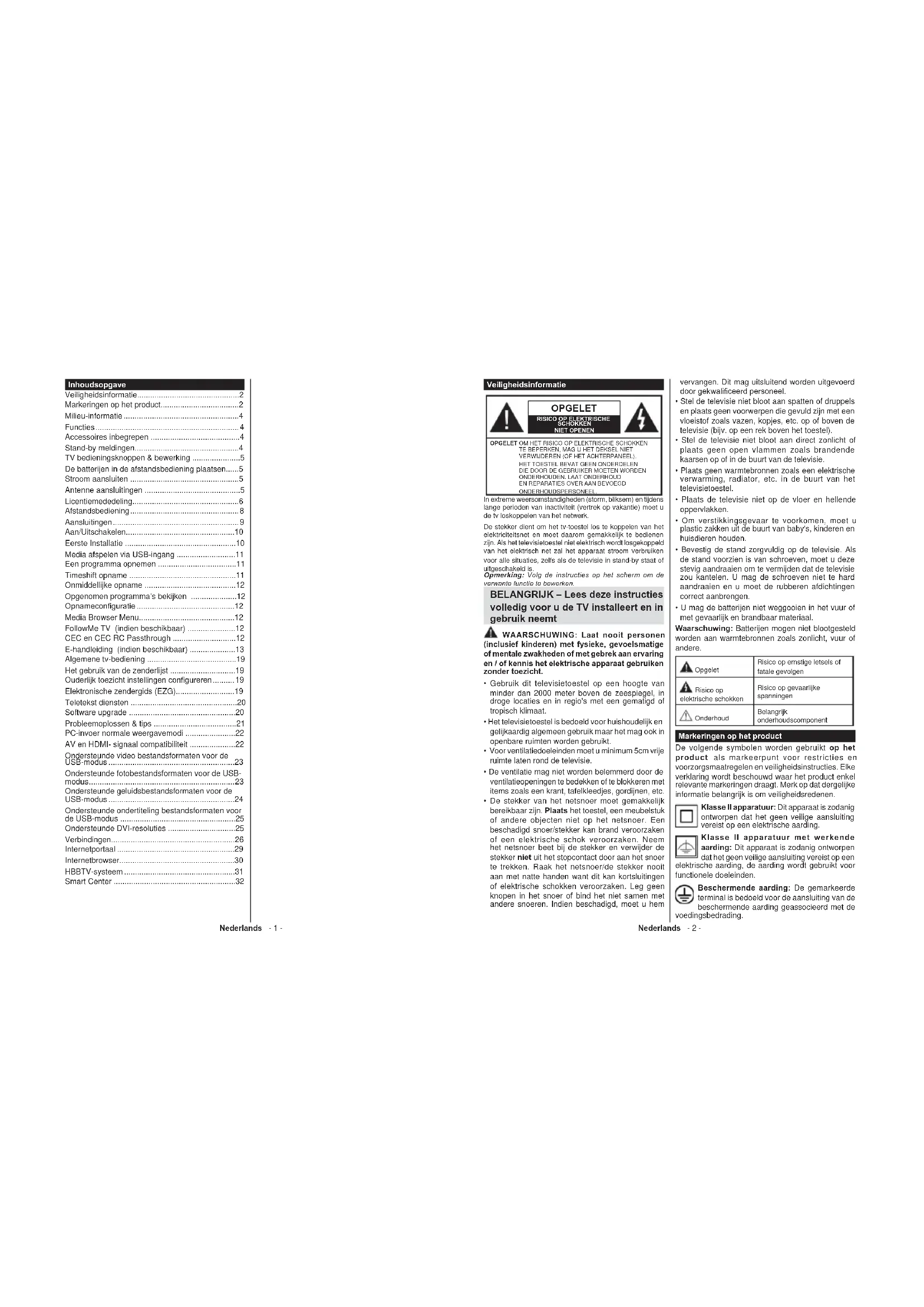 SCHOKKEN NIET OPENEN OPGELET OM HET RISICO OP ELEKTRISCHE SCHOKKEN TE BEPERKEN, MAG U HET DEKSEL NIET VERWIJDEREN (OF HET ACHTERPANEEL). HET TOESTEL BEVAT GEEN ONDERDELEN DIE DOOR DE GEBRUIKER MOETEN WORDEN ONDERHOUDEN. LAAT ONDERHOUD EN REPARATIES OVER AAN BEVOEGD ONDERHOUDSPERSONEEL. Opmerking: Volg de instructies op het scherm om de verwante functie te bewerken. In extreme weersomstandigheden (storm, bliksem) en tijdens lange perioden van inactiviteit (vertrek op vakantie) moet u de tv loskoppelen van het netwerk. De stekker dient om het tv-toestel los te koppelen van het elektriciteitsnet en moet daarom gemakkelijk te bedienen zijn. Als het televisietoestel niet elektrisch wordt losgekoppeld van het elektrisch net zal het apparaat stroom verbruiken voor alle situaties, zelfs als de televisie in stand-by staat of uitgeschakeld is. BELANGRIJK – Lees deze instructies volledig voor u de TV installeert en in gebruik neemt WAARSCHUWING: Laat nooit personen (inclusief kinderen) met fysieke, gevoelsmatige of mentale zwakheden of met gebrek aan ervaring en / of kennis het elektrische apparaat gebruiken zonder toezicht.