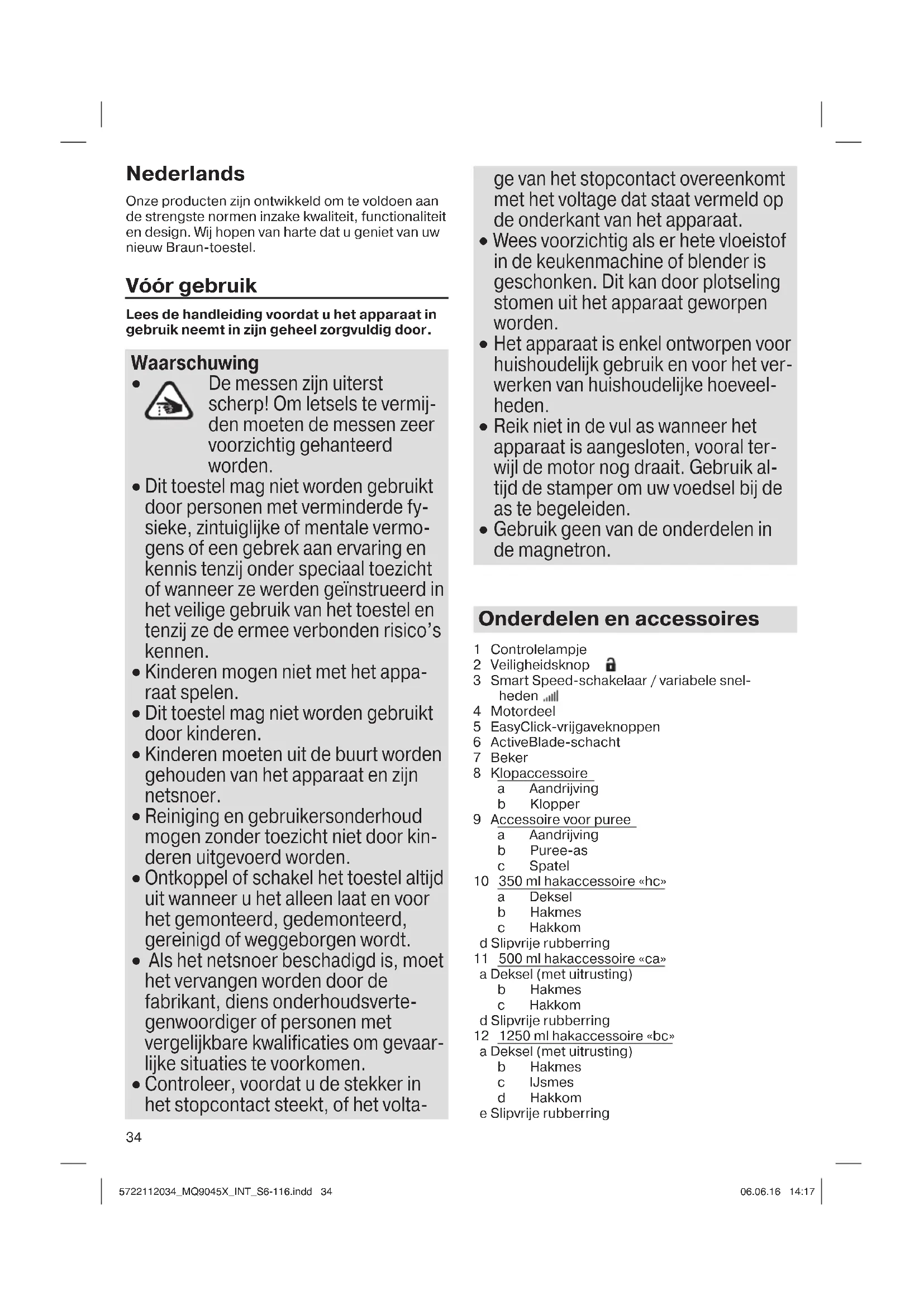 - Wanneer voedsel wordt verwerkt met hoger pigmentgehalte (bijv. wortels), kunnen de accessoires gaan verkleuren. Veeg deze onderdelen schoon met plantaardige olie voordat u ze reinigt. Zowel de ontwerpspecificaties als deze gebruiksaanwijzing kunnen zonder voorafgaande kennisgeving worden gewijzigd. Onderhevig aan verandering zonder kennisgeving. Gooi het product niet bij het huishoudelijk afval aan het eind van zijn levensduur. Breng het voor verwijdering naar een Service- centrum van Braun of naar een geschikt inzamelpunt in uw land. De materialen en voorwerpen bestemd om in aanraking te komen met levensmiddelen, zijn conform met de voorschriften van de Europese richtlijn 1935/2004. 5722112034_MQ9045X_INT_S6-116.indd 375722112034_MQ9045X_INT_S6-116.indd 37 06.06.16 14:1706.06.16 14:1738 Dansk Vores produkter er udviklet til at opfylde de højeste standarder for kvalitet, funktionalitet og design. Vi håber, at du rigtigt vil nyde din nye Braun-enhed. Før ibrugtagning Læs venligst instruktionerne grundigt og fuldstændigt inden brug af apparatet. Bemærk