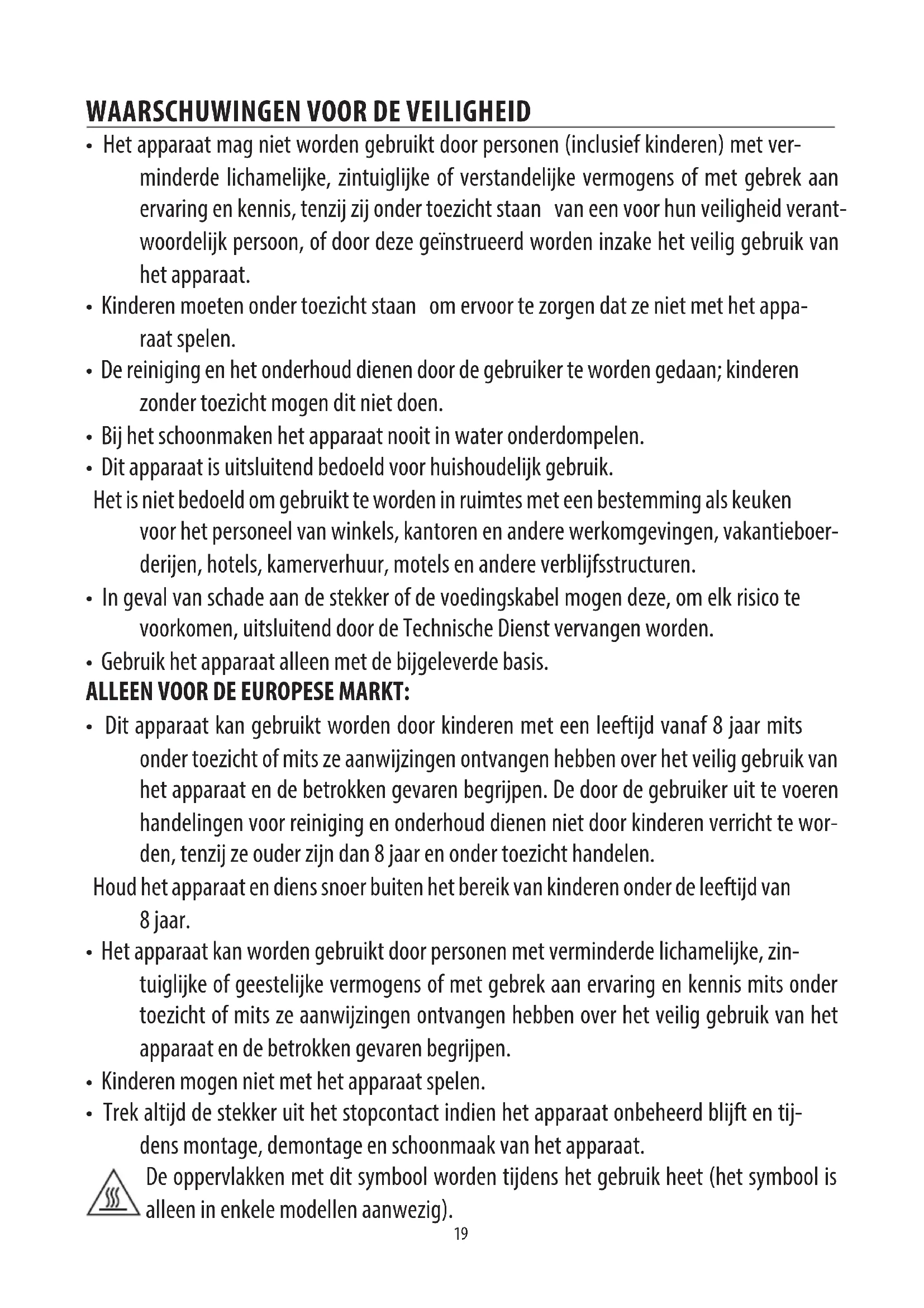 - Trek altijd de stekker uit het stopcontact indien het apparaat onbeheerd blijft en tij- dens montage, demontage en schoonmaak van het apparaat. De oppervlakken met dit symbool worden tijdens het gebruik heet (het symbool is alleen in enkele modellen aanwezig).20