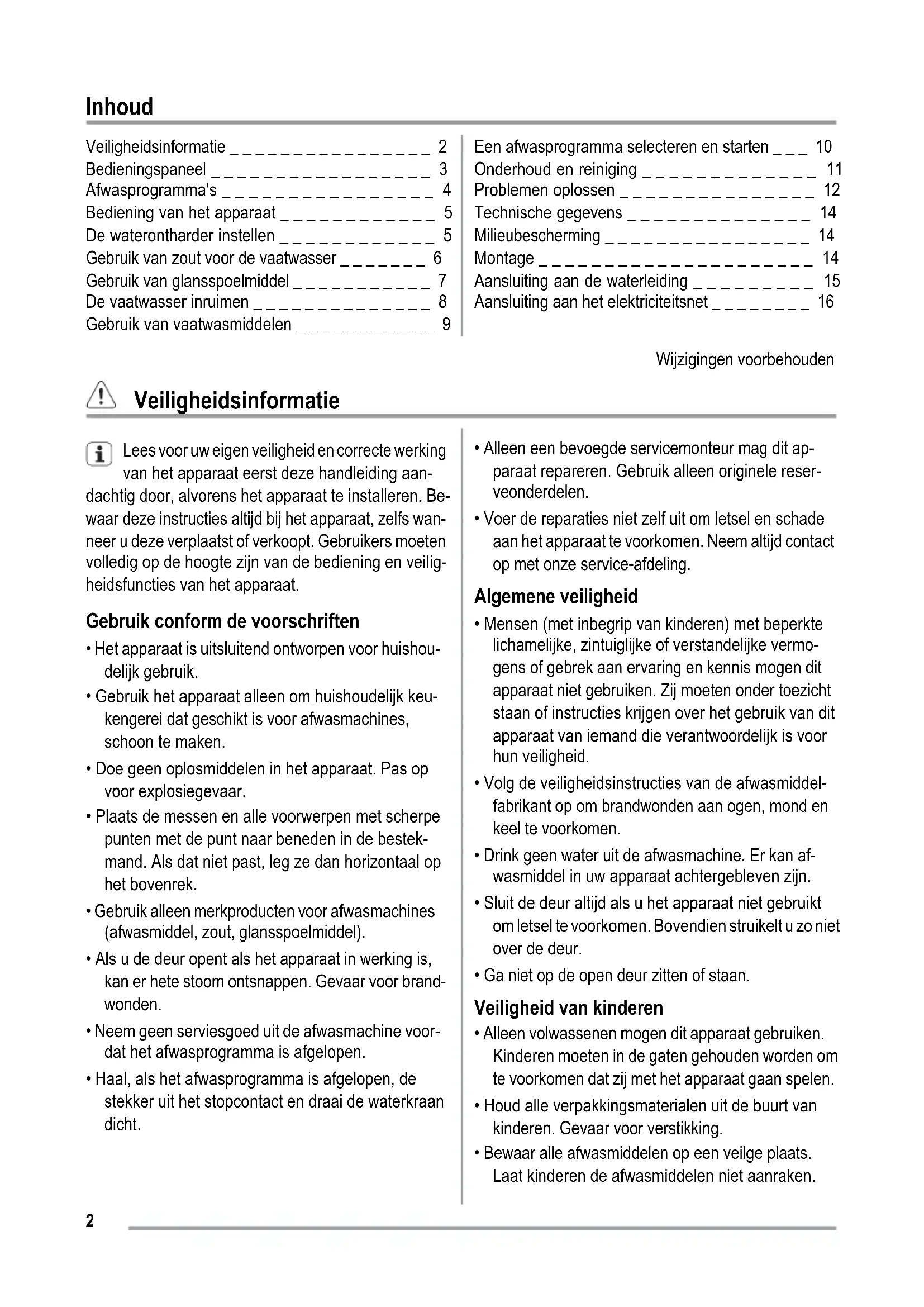 Gebruiks- aanwijzing Afwasmachine User manual Dishwasher Notice d'utilisation Lave-vaisselle Benutzer- information Geschirrspüler ZKI1410Inhoud Veiligheidsinformatie _ _ _ _ _ _ _ _ _ _ _ _ _ _ _ _ 2 Bedieningspaneel _ _ _ _ _ _ _ _ _ _ _ _ _ _ _ _ _ 3 Afwasprogramma's _ _ _ _ _ _ _ _ _ _ _ _ _ _ _ _ 4 Bediening van het apparaat _ _ _ _ _ _ _ _ _ _ _ _ 5 De waterontharder instellen _ _ _ _ _ _ _ _ _ _ _ _ 5 Gebruik van zout voor de vaatwasser _ _ _ _ _ _ _ 6 Gebruik van glansspoelmiddel _ _ _ _ _ _ _ _ _ _ _ 7 De vaatwasser inruimen _ _ _ _ _ _ _ _ _ _ _ _ _ _ 8 Gebruik van vaatwasmiddelen _ _ _ _ _ _ _ _ _ _ _ 9 Een afwasprogramma selecteren en starten _ _ _ 10 Onderhoud en reiniging _ _ _ _ _ _ _ _ _ _ _ _ _ 11 Problemen oplossen _ _ _ _ _ _ _ _ _ _ _ _ _ _ _ 12 Technische gegevens _ _ _ _ _ _ _ _ _ _ _ _ _ _ 14 Milieubescherming _ _ _ _ _ _ _ _ _ _ _ _ _ _ _ _ 14 Montage _ _ _ _ _ _ _ _ _ _ _ _ _ _ _ _ _ _ _ _ _ 14 Aansluiting aan de waterleiding _ _ _ _ _ _ _ _ _ 15 Aansluiting aan het elektriciteitsnet _ _ _ _ _ _ _ _ 16 Wijzigingen voorbehouden Veiligheidsinformatie Lees voor uw eigen veiligheid en correcte werking van het apparaat eerst deze handleiding aan- dachtig door, alvorens het apparaat te installeren. Be- waar deze instructies altijd bij het apparaat, zelfs wan- neer u deze verplaatst of verkoopt. Gebruikers moeten volledig op de hoogte zijn van de bediening en veilig- heidsfuncties van het apparaat. Gebruik conform de voorschriften