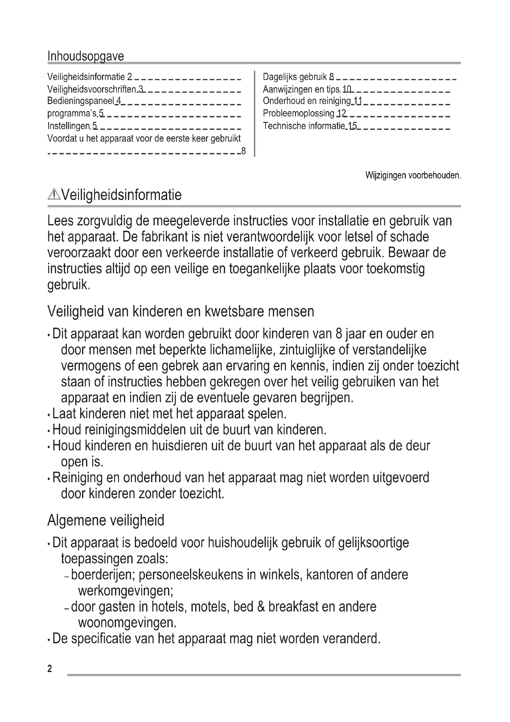 Dagelijks gebruik 8 Aanwijzingen en tips 10 Onderhoud en reiniging 11 Probleemoplossing 12 Technische informatie 15 Wijzigingen voorbehouden. Veiligheidsinformatie Lees zorgvuldig de meegeleverde instructies voor installatie en gebruik van het apparaat. De fabrikant is niet verantwoordelijk voor letsel of schade veroorzaakt door een verkeerde installatie of verkeerd gebruik. Bewaar de instructies altijd op een veilige en toegankelijke plaats voor toekomstig gebruik. Veiligheid van kinderen en kwetsbare mensen
