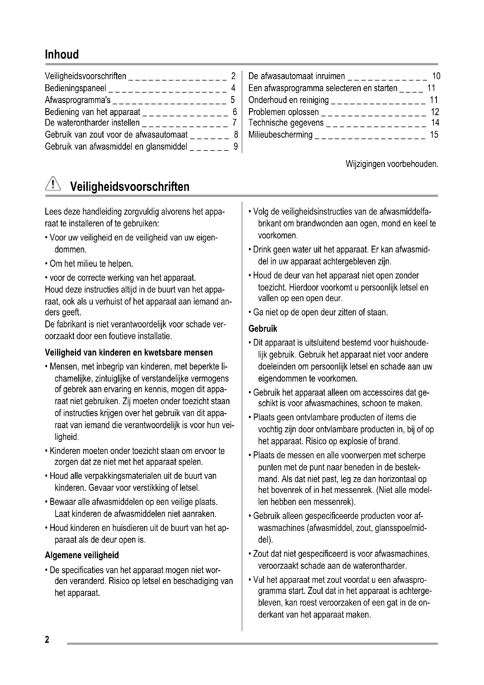 Gebruiks- aanwijzing Afwasautomaat User manual Dishwasher Notice d'utilisation Lave-vaisselle Benutzer- information Geschirrspüler ZKI1415Inhoud Veiligheidsvoorschriften _ _ _ _ _ _ _ _ _ _ _ _ _ _ _ 2 Bedieningspaneel _ _ _ _ _ _ _ _ _ _ _ _ _ _ _ _ _ _ 4 Afwasprogramma's _ _ _ _ _ _ _ _ _ _ _ _ _ _ _ _ _ _ 5 Bediening van het apparaat _ _ _ _ _ _ _ _ _ _ _ _ _ 6 De waterontharder instellen _ _ _ _ _ _ _ _ _ _ _ _ _ 7 Gebruik van zout voor de afwasautomaat _ _ _ _ _ _ 8 Gebruik van afwasmiddel en glansmiddel _ _ _ _ _ _ 9 De afwasautomaat inruimen _ _ _ _ _ _ _ _ _ _ _ _ 10 Een afwasprogramma selecteren en starten _ _ _ _ 11 Onderhoud en reiniging _ _ _ _ _ _ _ _ _ _ _ _ _ _ _ 11 Problemen oplossen _ _ _ _ _ _ _ _ _ _ _ _ _ _ _ _ 12 Technische gegevens _ _ _ _ _ _ _ _ _ _ _ _ _ _ _ 14 Milieubescherming _ _ _ _ _ _ _ _ _ _ _ _ _ _ _ _ _ 15 Wijzigingen voorbehouden. Veiligheidsvoorschriften Lees deze handleiding zorgvuldig alvorens het appa- raat te installeren of te gebruiken: