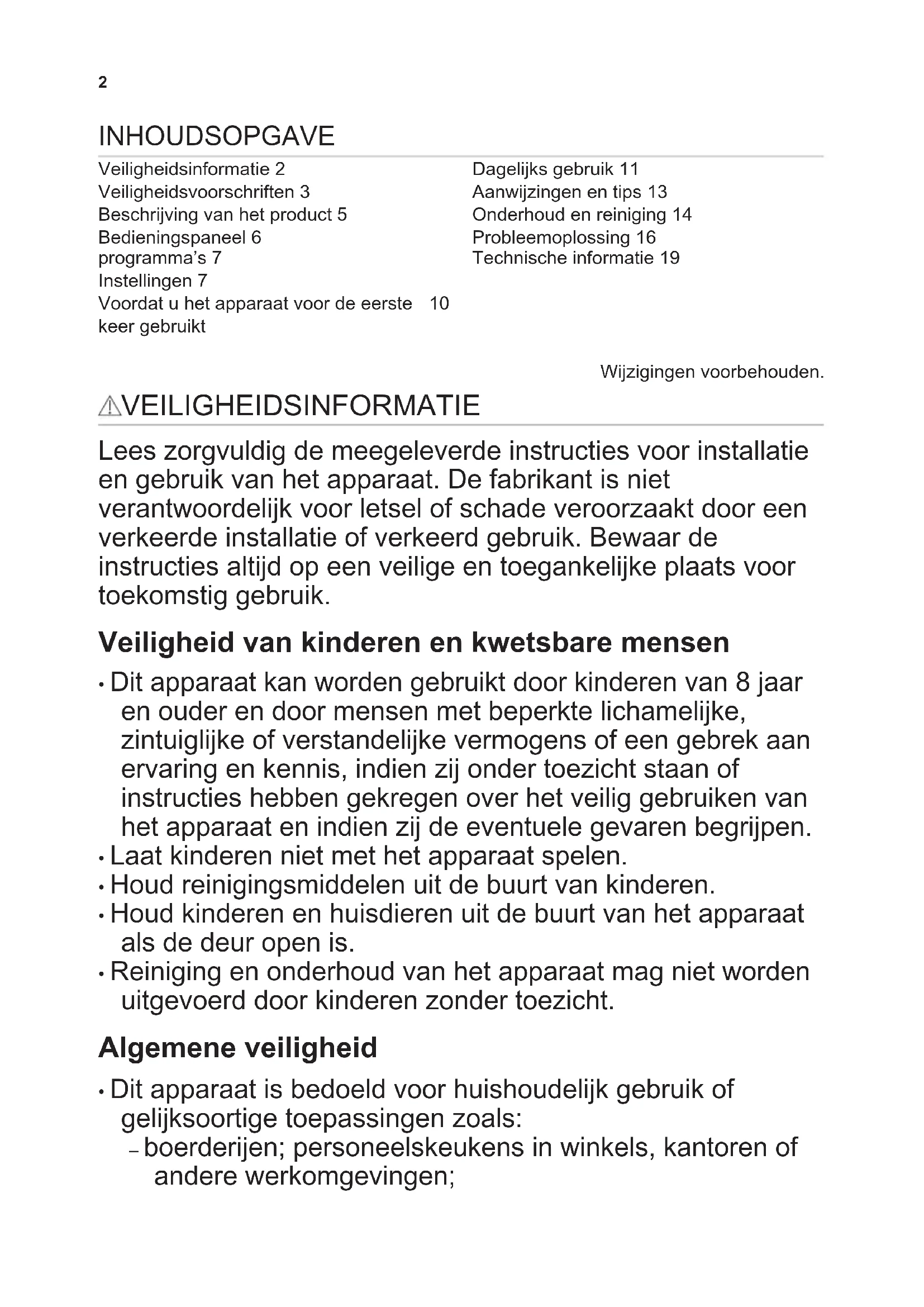 Dagelijks gebruik 11 Aanwijzingen en tips 13 Onderhoud en reiniging 14 Probleemoplossing 16 Technische informatie 19 Wijzigingen voorbehouden. VEILIGHEIDSINFORMATIE Lees zorgvuldig de meegeleverde instructies voor installatie en gebruik van het apparaat. De fabrikant is niet verantwoordelijk voor letsel of schade veroorzaakt door een verkeerde installatie of verkeerd gebruik. Bewaar de instructies altijd op een veilige en toegankelijke plaats voor toekomstig gebruik. Veiligheid van kinderen en kwetsbare mensen