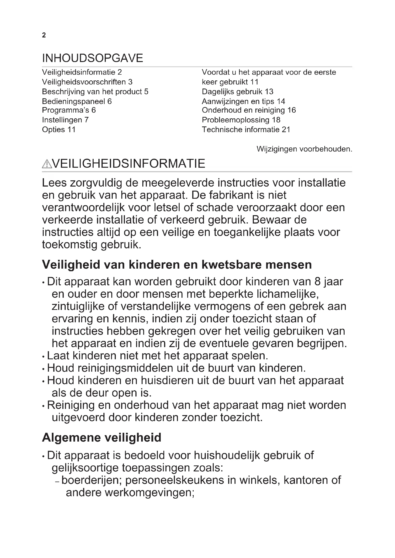 JGVN60528 Gebruik‐ saanwijzing Afwasauto‐ maat Notice d'utili‐ sation Lave-vais‐ selle Benutzerin‐ formation Geschirrspü‐ lerINHOUDSOPGAVE Veiligheidsinformatie 2 Veiligheidsvoorschriften 3 Beschrijving van het product 5 Bedieningspaneel 6 Programma’s 6 Instellingen 7 Opties 11 Voordat u het apparaat voor de eerste keer gebruikt 11 Dagelijks gebruik 13 Aanwijzingen en tips 14 Onderhoud en reiniging 16 Probleemoplossing 18 Technische informatie 21 Wijzigingen voorbehouden. VEILIGHEIDSINFORMATIE Lees zorgvuldig de meegeleverde instructies voor installatie en gebruik van het apparaat. De fabrikant is niet verantwoordelijk voor letsel of schade veroorzaakt door een verkeerde installatie of verkeerd gebruik. Bewaar de instructies altijd op een veilige en toegankelijke plaats voor toekomstig gebruik. Veiligheid van kinderen en kwetsbare mensen