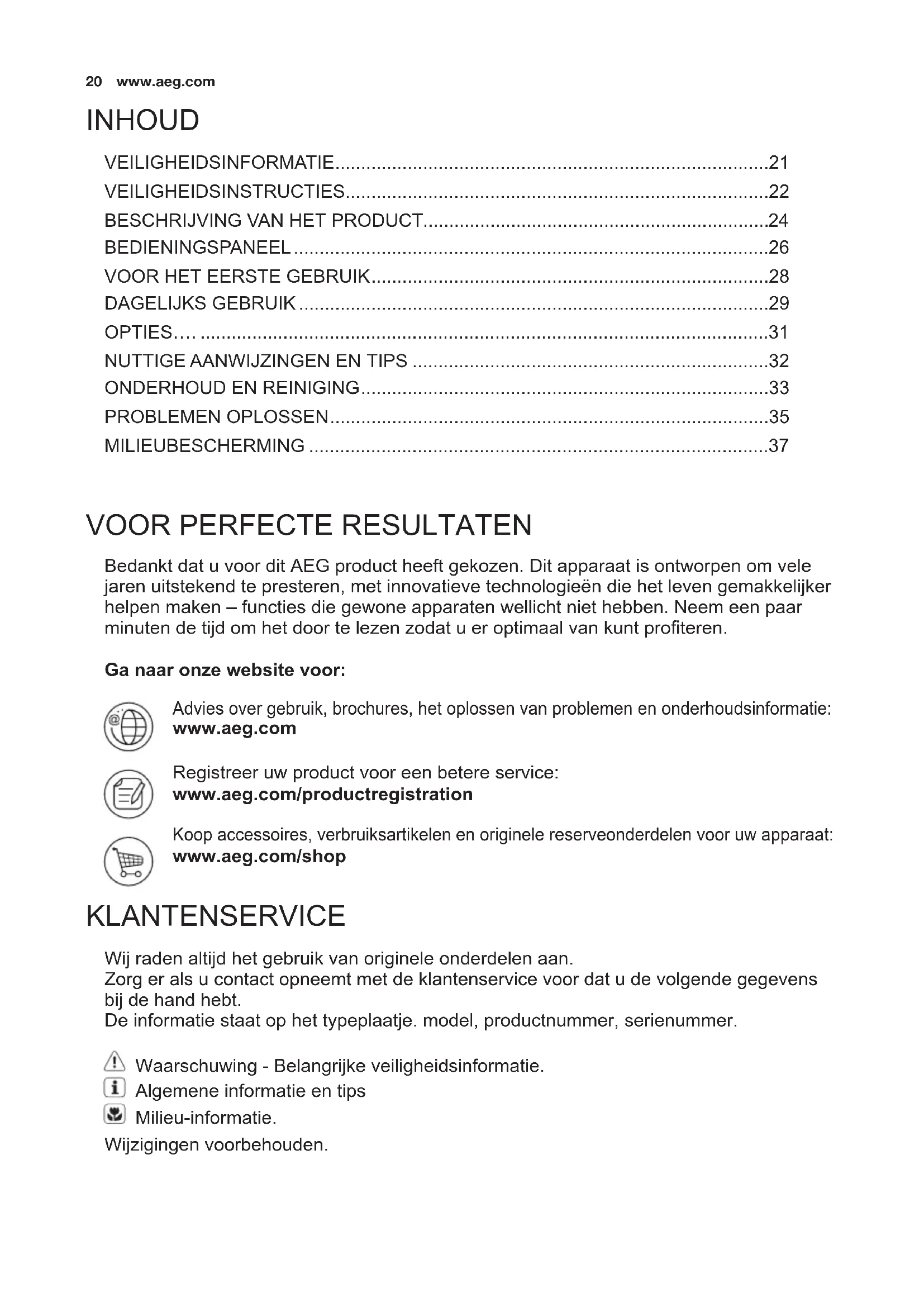 Bedankt dat u voor dit AEG product heeft gekozen. Dit apparaat is ontworpen om vele jaren uitstekend te presteren, met innovatieve technologieën die het leven gemakkelijker helpen maken – functies die gewone apparaten wellicht niet hebben. Neem een paar minuten de tijd om het door te lezen zodat u er optimaal van kunt proteren. Ga naar onze website voor: Advies over gebruik, brochures, het oplossen van problemen en onderhoudsinformatie: www.aeg.com Registreer uw product voor een betere service: www.aeg.com/productregistration Koop accessoires, verbruiksartikelen en originele reserveonderdelen voor uw apparaat: www.aeg.com/shop KLANTENSERVICE Wij raden altijd het gebruik van originele onderdelen aan. Zorg er als u contact opneemt met de klantenservice voor dat u de volgende gegevens bij de hand hebt. De informatie staat op het typeplaatje. model, productnummer, serienummer. Waarschuwing - Belangrijke veiligheidsinformatie. Algemene informatie en tips Milieu-informatie. Wijzigingen voorbehouden.
