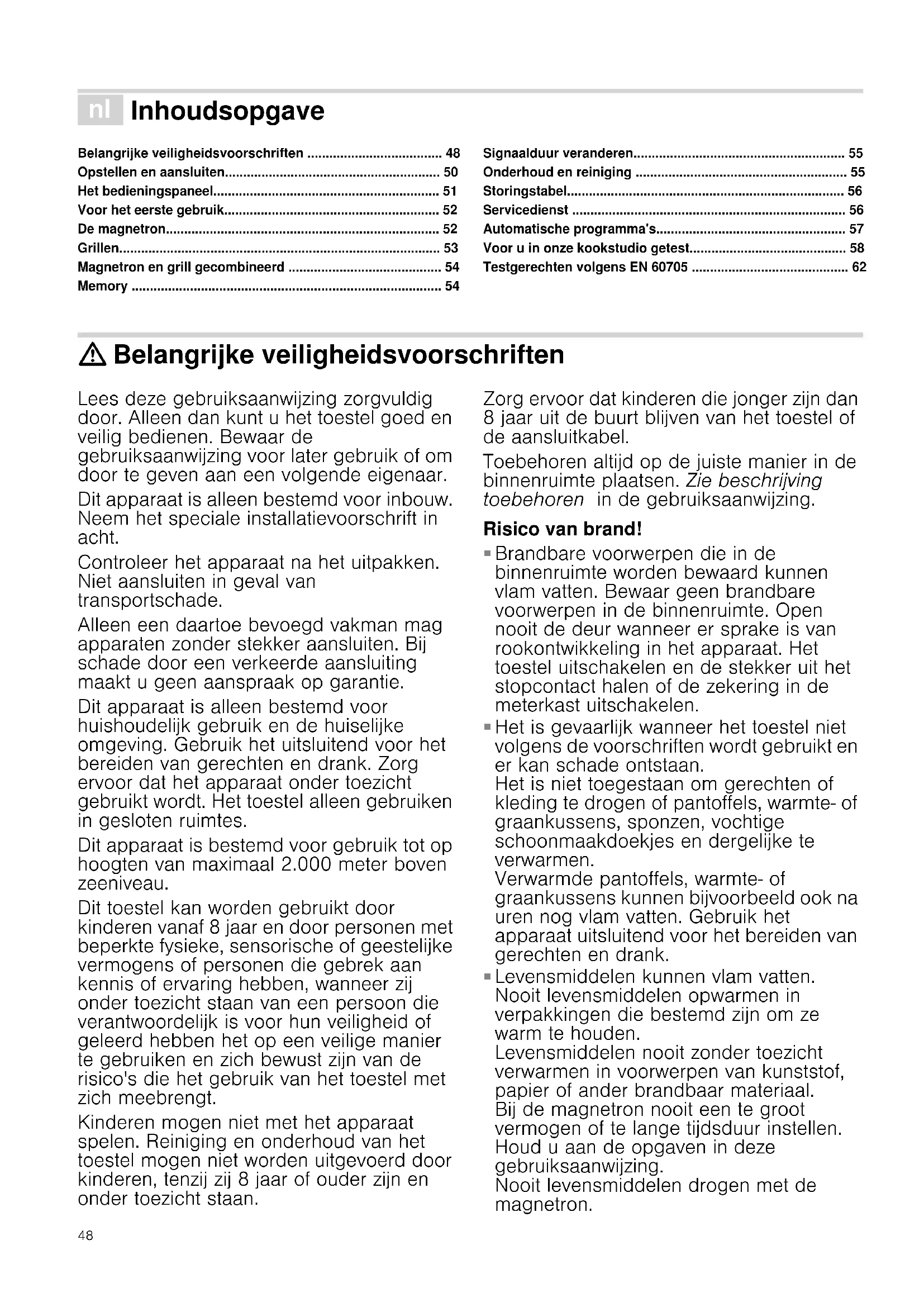 - Testgerechten volgens EN 60705 : Belangrijke veiligheidsvoorschriften Lees deze gebruiksaanwijzing zorgvuldig door. Alleen dan kunt u het toestel goed en veilig bedienen. Bewaar de gebruiksaanwijzing voor later gebruik of om door te geven aan een volgende eigenaar. Dit apparaat is alleen bestemd voor inbouw. Neem het speciale installatievoorschrift in acht. Controleer het apparaat na het uitpakken. Niet aansluiten in geval van transportschade. Alleen een daartoe bevoegd vakman mag apparaten zonder stekker aansluiten. Bij schade door een verkeerde aansluiting maakt u geen aanspraak op garantie. Dit apparaat is alleen bestemd voor huishoudelijk gebruik en de huiselijke omgeving. Gebruik het uitsluitend voor het bereiden van gerechten en drank. Zorg ervoor dat het apparaat onder toezicht gebruikt wordt. Het toestel alleen gebruiken in gesloten ruimtes. Dit apparaat is bestemd voor gebruik tot op hoogten van maximaal 2.000 meter boven zeeniveau. Dit toestel kan worden gebruikt door kinderen vanaf 8 jaar en door personen met beperkte fysieke, sensorische of geestelijke vermogens of personen die gebrek aan kennis of ervaring hebben, wanneer zij onder toezicht staan van een persoon die verantwoordelijk is voor hun veiligheid of geleerd hebben het op een veilige manier te gebruiken en zich bewust zijn van de risico's die het gebruik van het toestel met zich meebrengt. Kinderen mogen niet met het apparaat spelen. Reiniging en onderhoud van het toestel mogen niet worden uitgevoerd door kinderen, tenzij zij 8 jaar of ouder zijn en onder toezicht staan. Zorg ervoor dat kinderen die jonger zijn dan 8 jaar uit de buurt blijven van het toestel of de aansluitkabel. Toebehoren altijd op de juiste manier in de binnenruimte plaatsen. Zie beschrijving toebehoren in de gebruiksaanwijzing. Risico van brand! p. 62