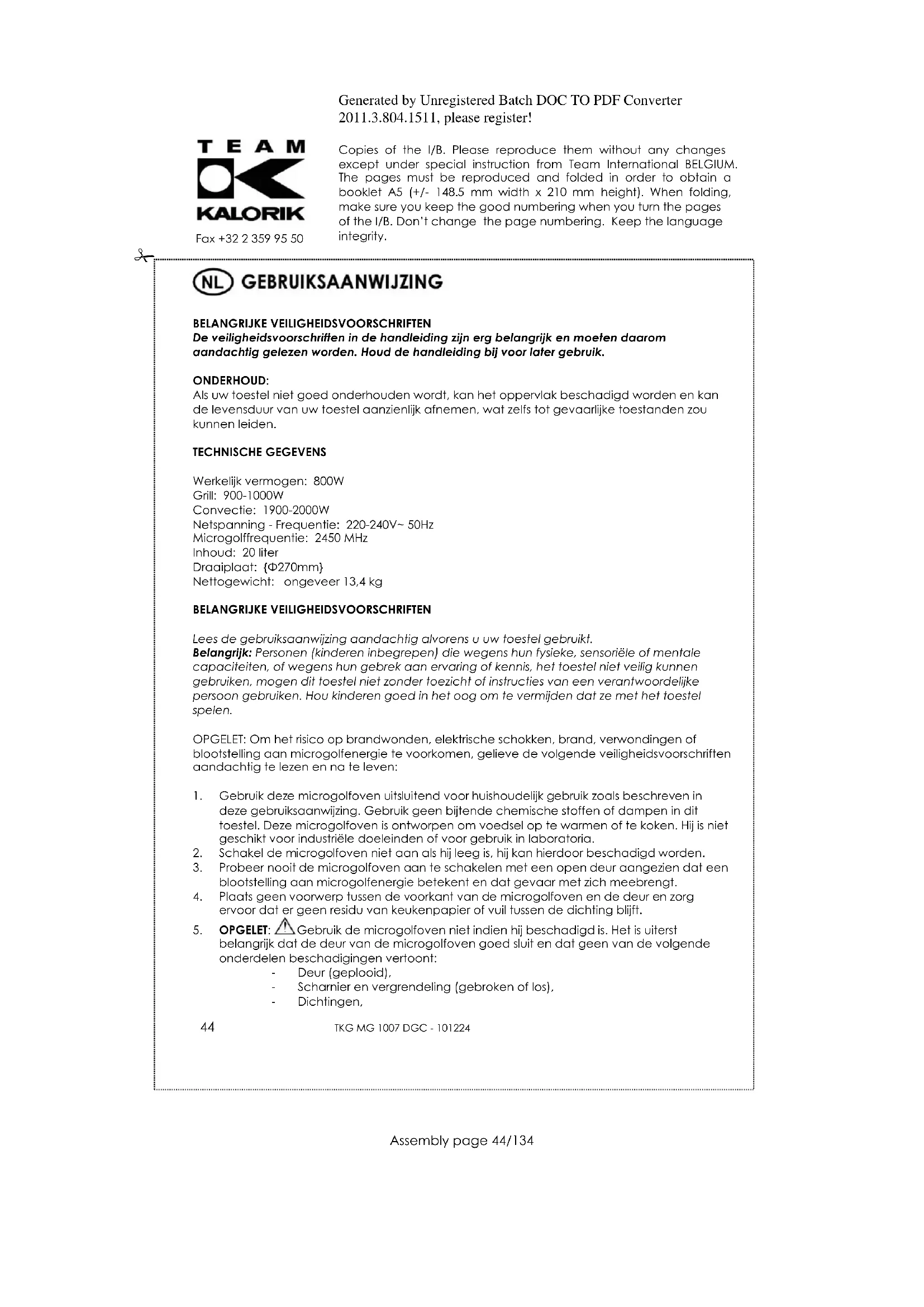 c) Controleer of de zekeringen van uw elektrische installatie zijn doorgeslagen en of de stroomonderbreker geactiveerd is. Als deze in orde zijn, test dan het stopcontact door een ander apparaat erop aan te sluiten. d) Controleer of het bedieningspaneel goed geprogrammeerd is en of de timer is ingesteld. e) Controleer of de deur goed gesloten is. Als dat niet het geval is, zal de microgolfenergie niet in de microgolfoven stralen. INDIEN U BOVENSTAANDE PUNTEN GECONTROLEERD HEBT EN DE MICROGOLFOVEN FUNCTIONEERT NOG NIET, NEEM DAN CONTACT OP MET EEN BEKWAME GEKWALIFICEERDE DIENST.Generated by Unregistered Batch DOC TO PDF Converter 2011.3.804.1511, please register! Copies of the I/B. Please reproduce them without any changes except under special instruction from Team International BELGIUM. The pages must be reproduced and folded in order to obtain a booklet A5 (+/- 148.5 mm width x 210 mm height). When folding, make sure you keep the good numbering when you turn the pages of the I/B. Don‟t change the page numbering. Keep the language integrity.