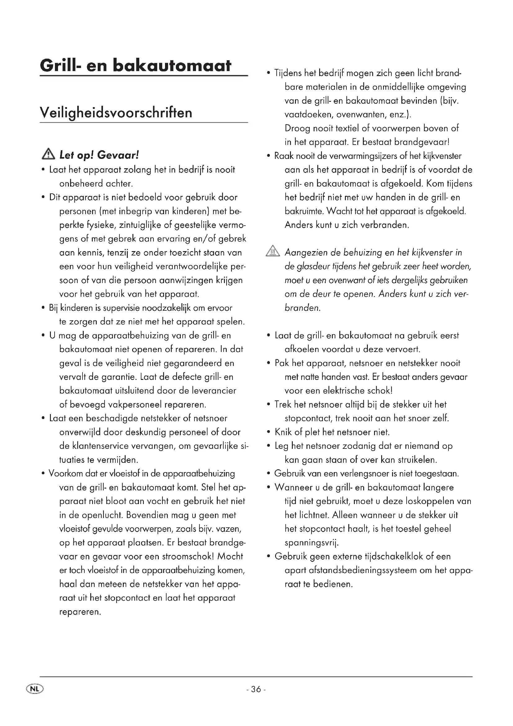 - Voorkom dat er vloeistof in de apparaatbehuizing van de grill- en bakautomaat komt. Stel het ap- paraat niet bloot aan vocht en gebruik het niet in de openlucht. Bovendien mag u geen met vloeistof gevulde voorwerpen, zoals bijv. vazen, op het apparaat plaatsen. Er bestaat brandge- vaar en gevaar voor een stroomschok! Mocht er toch vloeistof in de apparaatbehuizing komen, haal dan meteen de netstekker van het appa- raat uit het stopcontact en laat het apparaat repareren.