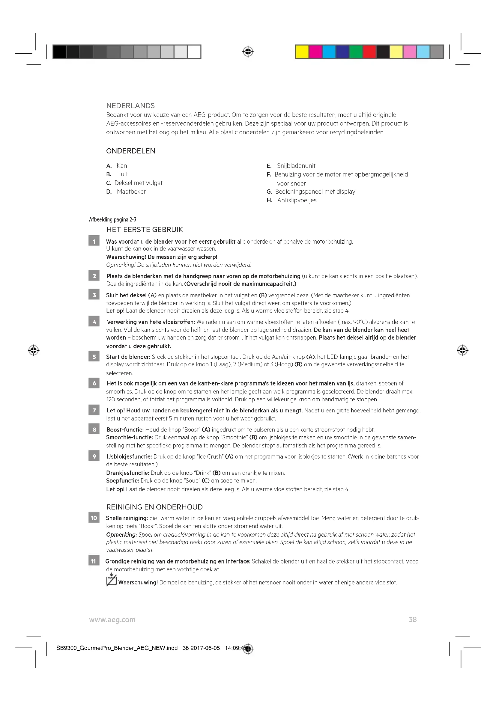 10 Snelle reiniging: giet warm water in de kan en voeg enkele druppels afwasmiddel toe. Meng water en detergent door te druk- ken op toets “Boost”. Spoel de kan ten slotte onder stromend water uit. Opmerking: Spoel om craquelévorming in de kan te voorkomen deze altijd direct na gebruik af met schoon water, zodat het plastic materiaal niet beschadigd raakt door zuren of essentiële oliën. Spoel de kan altijd schoon, zelfs voordat u deze in de vaatwasser plaatst. 11 Grondige reiniging van de motorbehuizing en interface: Schakel de blender uit en haal de stekker uit het stopcontact. Veeg de motorbehuizing met een vochtige doek af. Waarschuwing! Dompel de behuizing, de stekker of het netsnoer nooit onder in water of enige andere vloeistof. SB9300_GourmetPro_Blender_AEG_NEW.indd 38 2017-06-05 14:09:4539 www.aeg.com