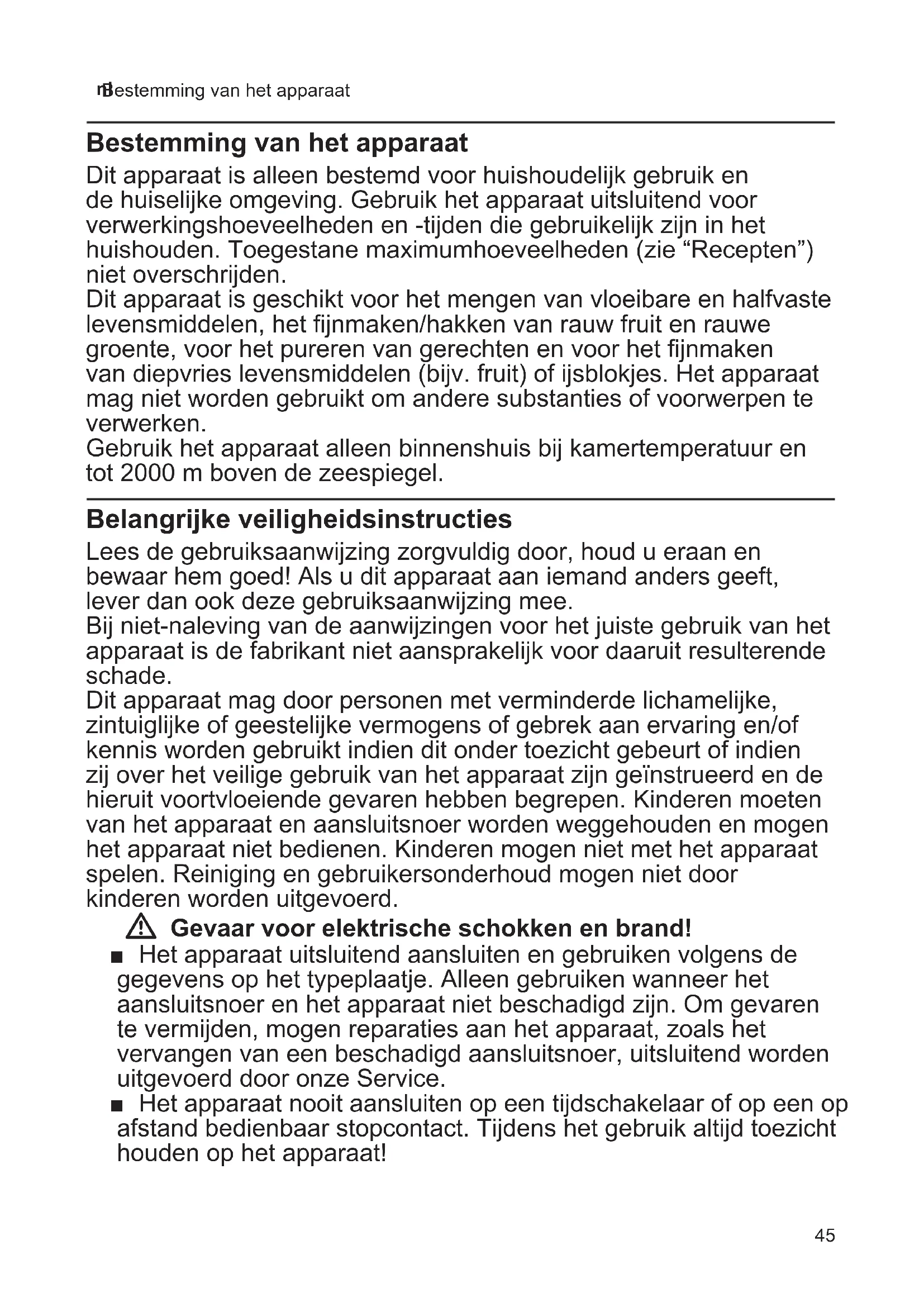 Bestemming van het apparaat Bestemming van het apparaat Dit apparaat is alleen bestemd voor huishoudelijk gebruik en de huiselijke omgeving. Gebruik het apparaat uitsluitend voor verwerkingshoeveelheden en -tijden die gebruikelijk zijn in het huishouden. Toegestane maximumhoeveelheden (zie “Recepten”) niet overschrijden. Dit apparaat is geschikt voor het mengen van vloeibare en halfvaste levensmiddelen, het fijnmaken/hakken van rauw fruit en rauwe groente, voor het pureren van gerechten en voor het fijnmaken van diepvries levensmiddelen (bijv. fruit) of ijsblokjes. Het apparaat mag niet worden gebruikt om andere substanties of voorwerpen te verwerken. Gebruik het apparaat alleen binnenshuis bij kamertemperatuur en tot 2000 m boven de zeespiegel. Belangrijke veiligheidsinstructies Lees de gebruiksaanwijzing zorgvuldig door, houd u eraan en bewaar hem goed! Als u dit apparaat aan iemand anders geeft, lever dan ook deze gebruiksaanwijzing mee. Bij niet-naleving van de aanwijzingen voor het juiste gebruik van het apparaat is de fabrikant niet aansprakelijk voor daaruit resulterende schade. Dit apparaat mag door personen met verminderde lichamelijke, zintuiglijke of geestelijke vermogens of gebrek aan ervaring en/of kennis worden gebruikt indien dit onder toezicht gebeurt of indien zij over het veilige gebruik van het apparaat zijn geïnstrueerd en de hieruit voortvloeiende gevaren hebben begrepen. Kinderen moeten van het apparaat en aansluitsnoer worden weggehouden en mogen het apparaat niet bedienen. Kinderen mogen niet met het apparaat spelen. Reiniging en gebruikersonderhoud mogen niet door kinderen worden uitgevoerd. W Gevaar voor elektrische schokken en brand! ■ Het apparaat uitsluitend aansluiten en gebruiken volgens de gegevens op het typeplaatje. Alleen gebruiken wanneer het aansluitsnoer en het apparaat niet beschadigd zijn. Om gevaren te vermijden, mogen reparaties aan het apparaat, zoals het vervangen van een beschadigd aansluitsnoer, uitsluitend worden uitgevoerd door onze Service. ■ Het apparaat nooit aansluiten op een tijdschakelaar of op een op afstand bedienbaar stopcontact. Tijdens het gebruik altijd toezicht houden op het apparaat!46 nl Belangrijke veiligheidsinstructies ■ Het apparaat niet neerzetten op of in de buurt van hete oppervlakken, zoals fornuisplaten. Het netsnoer niet met hete delen in aanraking brengen of over scherpe randen trekken. ■ Het basisapparaat niet in water dompelen en niet in de vaatwasser doen. Gebruik geen stoomreiniger. Het apparaat niet met vochtige handen gebruiken. ■ Het apparaat moet na ieder gebruik, als er geen toezicht aanwezig is, voor de montage, demontage of reiniging en bij storingen altijd van het net worden gescheiden. W Gevaar voor letsel! ■ Voordat u toebehoren of hulpstukken vervangt die bewegen tijdens het gebruik, moet het apparaat worden uitgeschakeld en worden losgemaakt van het stroomnet. ■ Grijp nooit in de aangebrachte mixer! Gebruik de mixer nooit als het deksel niet is aangebracht. ■ Voorzichtig bij de omgang met de scherpe messen, bij het legen van het reservoir en bij het reinigen. ■ Voor het uitschakelen altijd de draaiknop tot aan de aanslag linksom draaien (nulstand). ■ Na het uitschakelen loopt de aandrijving nog even na. Wacht tot de aandrijving geheel stilstaat. ■ Het apparaat alleen in compleet samengebouwde toestand gebruiken. W Risico van brandwonden! ■ Voorzichtig bij het vullen met hete vloeistoffen. Door plotselinge stoomvorming kan de vloeistof uit het reservoir spatten. ■ Het deksel tijdens het gebruik altijd met een hand vasthouden. Daarbij de hand niet boven de vulopening houden! Bij verwerking van hete mixvloeistoffen komt er stoom uit de vulopening in het deksel. W Verstikkingsgevaar! Laat kinderen niet met verpakkingsmateriaal spelen. W Attentie! ■ Erop letten dat er zich geen vreemde voorwerpen in de mixkom bevinden. Niet met voorwerpen (bijv. messen, lepels) in de mixkom komen. Uitsluitend de bijgevoegde stopper bij het gesloten deksel gebruiken! ■ Wij adviseren u het apparaat niet langer ingeschakeld te laten dan nodig is voor het verwerken van het levensmiddel. Niet onbelast laten lopen.47