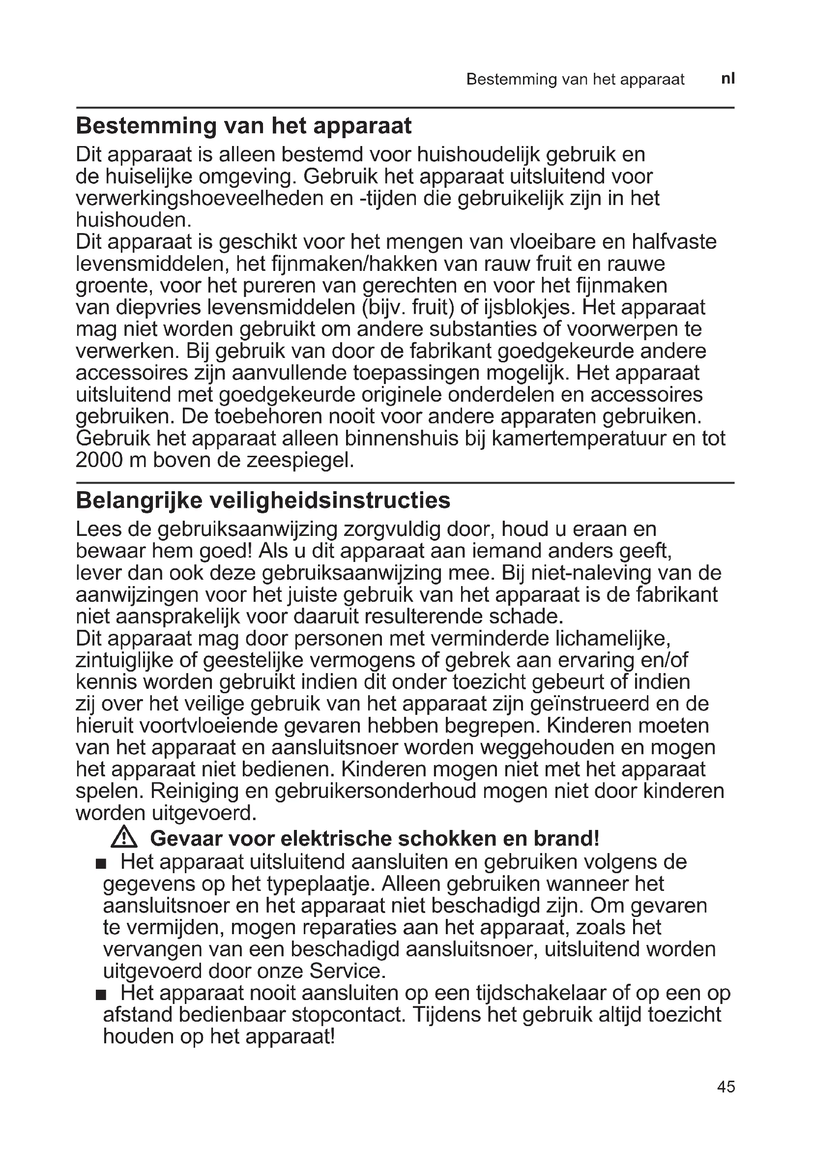 Bestemming van het apparaat Dit apparaat is alleen bestemd voor huishoudelijk gebruik en de huiselijke omgeving. Gebruik het apparaat uitsluitend voor verwerkingshoeveelheden en -tijden die gebruikelijk zijn in het huishouden. Dit apparaat is geschikt voor het mengen van vloeibare en halfvaste levensmiddelen, het jnmaken/hakken van rauw fruit en rauwe groente, voor het pureren van gerechten en voor het jnmaken van diepvries levensmiddelen (bijv. fruit) of ijsblokjes. Het apparaat mag niet worden gebruikt om andere substanties of voorwerpen te verwerken. Bij gebruik van door de fabrikant goedgekeurde andere accessoires zijn aanvullende toepassingen mogelijk. Het apparaat uitsluitend met goedgekeurde originele onderdelen en accessoires gebruiken. De toebehoren nooit voor andere apparaten gebruiken. Gebruik het apparaat alleen binnenshuis bij kamertemperatuur en tot 2000 m boven de zeespiegel. Belangrijke veiligheidsinstructies Lees de gebruiksaanwijzing zorgvuldig door, houd u eraan en bewaar hem goed! Als u dit apparaat aan iemand anders geeft, lever dan ook deze gebruiksaanwijzing mee. Bij niet-naleving van de aanwijzingen voor het juiste gebruik van het apparaat is de fabrikant niet aansprakelijk voor daaruit resulterende schade. Dit apparaat mag door personen met verminderde lichamelijke, zintuiglijke of geestelijke vermogens of gebrek aan ervaring en/of kennis worden gebruikt indien dit onder toezicht gebeurt of indien zij over het veilige gebruik van het apparaat zijn geïnstrueerd en de hieruit voortvloeiende gevaren hebben begrepen. Kinderen moeten van het apparaat en aansluitsnoer worden weggehouden en mogen het apparaat niet bedienen. Kinderen mogen niet met het apparaat spelen. Reiniging en gebruikersonderhoud mogen niet door kinderen worden uitgevoerd. W Gevaar voor elektrische schokken en brand! ■ Het apparaat uitsluitend aansluiten en gebruiken volgens de gegevens op het typeplaatje. Alleen gebruiken wanneer het aansluitsnoer en het apparaat niet beschadigd zijn. Om gevaren te vermijden, mogen reparaties aan het apparaat, zoals het vervangen van een beschadigd aansluitsnoer, uitsluitend worden uitgevoerd door onze Service. ■ Het apparaat nooit aansluiten op een tijdschakelaar of op een op afstand bedienbaar stopcontact. Tijdens het gebruik altijd toezicht houden op het apparaat!46 Belangrijke veiligheidsinstructies
