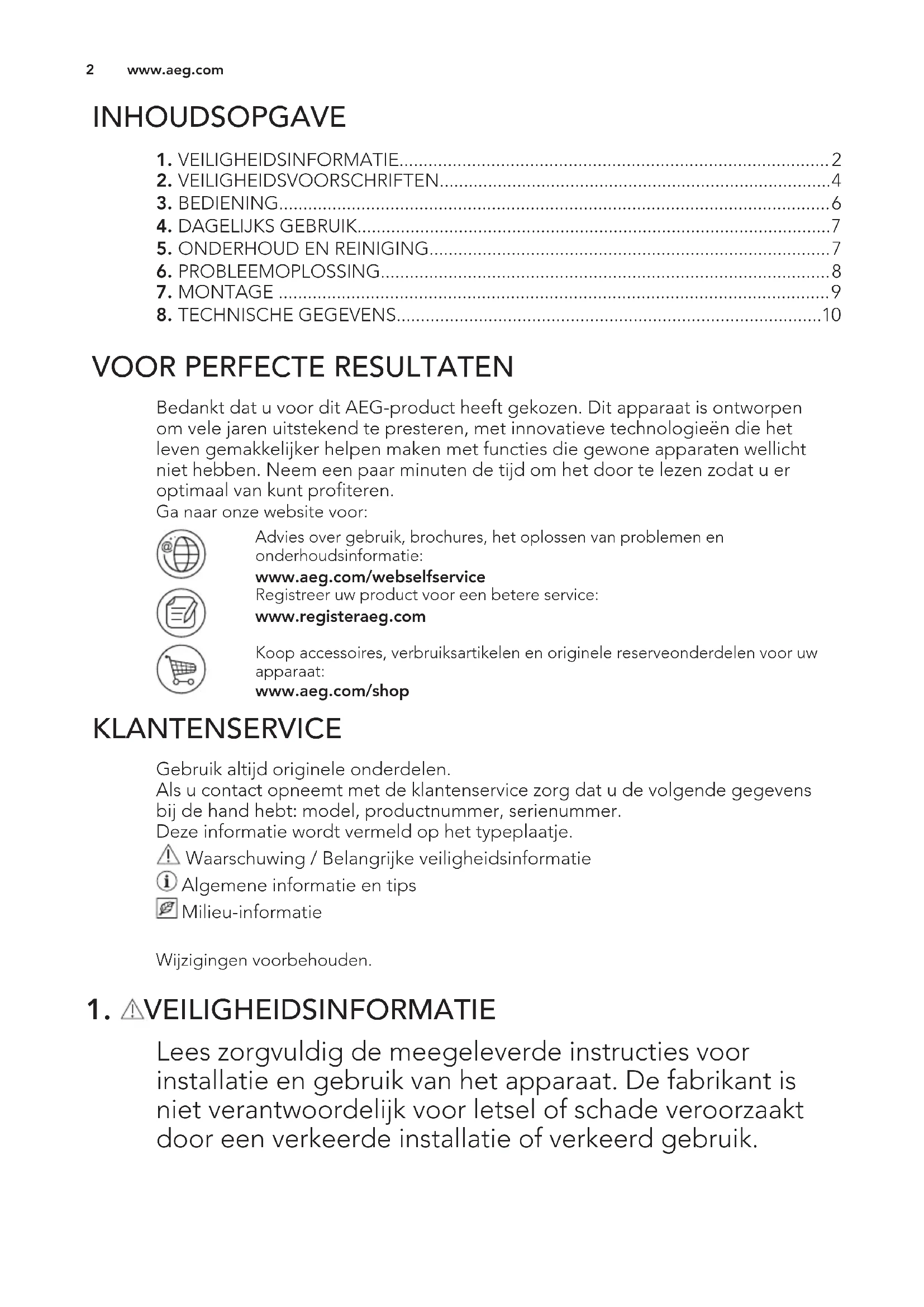 Bedankt dat u voor dit AEG-product heeft gekozen. Dit apparaat is ontworpen om vele jaren uitstekend te presteren, met innovatieve technologieën die het leven gemakkelijker helpen maken met functies die gewone apparaten wellicht niet hebben. Neem een paar minuten de tijd om het door te lezen zodat u er optimaal van kunt profiteren. Ga naar onze website voor: Advies over gebruik, brochures, het oplossen van problemen en onderhoudsinformatie: www.aeg.com/webselfservice Registreer uw product voor een betere service: www.registeraeg.com Koop accessoires, verbruiksartikelen en originele reserveonderdelen voor uw apparaat: www.aeg.com/shop KLANTENSERVICE Gebruik altijd originele onderdelen. Als u contact opneemt met de klantenservice zorg dat u de volgende gegevens bij de hand hebt: model, productnummer, serienummer. Deze informatie wordt vermeld op het typeplaatje. Waarschuwing / Belangrijke veiligheidsinformatie Algemene informatie en tips Milieu-informatie Wijzigingen voorbehouden.
