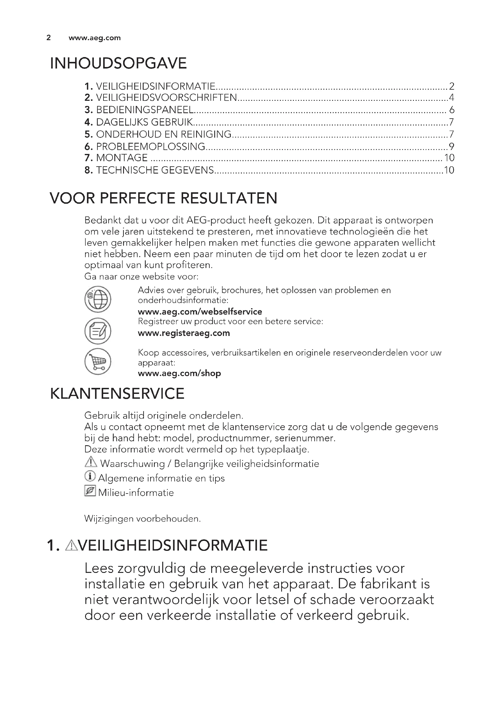 Bedankt dat u voor dit AEG-product heeft gekozen. Dit apparaat is ontworpen om vele jaren uitstekend te presteren, met innovatieve technologieën die het leven gemakkelijker helpen maken met functies die gewone apparaten wellicht niet hebben. Neem een paar minuten de tijd om het door te lezen zodat u er optimaal van kunt profiteren. Ga naar onze website voor: Advies over gebruik, brochures, het oplossen van problemen en onderhoudsinformatie: www.aeg.com/webselfservice Registreer uw product voor een betere service: www.registeraeg.com Koop accessoires, verbruiksartikelen en originele reserveonderdelen voor uw apparaat: www.aeg.com/shop KLANTENSERVICE Gebruik altijd originele onderdelen. Als u contact opneemt met de klantenservice zorg dat u de volgende gegevens bij de hand hebt: model, productnummer, serienummer. Deze informatie wordt vermeld op het typeplaatje. Waarschuwing / Belangrijke veiligheidsinformatie Algemene informatie en tips Milieu-informatie Wijzigingen voorbehouden.