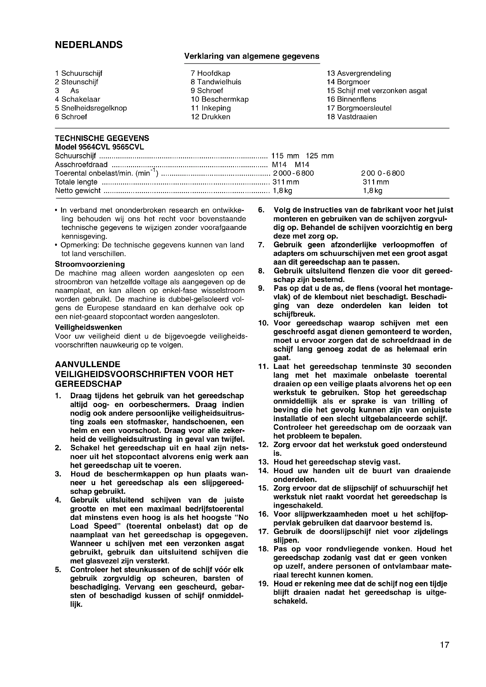- Continu gebruik van een versleten schijf kan er oor- zaak van zijn dat de schijf explodeert met ernstig per- soonlijk letsel als gevolg. ONDERHOUD LET OP: Zorg er altijd voor dat het gereedschap is uitgeschakeld en de stekker uit het stopcontact is verwijderd alvorens onderhoud aan het gereedschap uit te voeren. Reparatie en onderhoud Houd het gereedschap zelf en vooral de ventilatieopenin- gen voor luchtkoeling altijd schoon. Wanneer verontreini- gingen (stof e.d.) in deze onderdelen zijn terechtgekomen, moet u deze verwijderen. Reinig regel- matig al naar gelang de hoeveelheid stof die werd voort- gebracht en in het gereedschap is binnnengedrongen. Verwijder de hoofdkap indien deze op het gereedschap gemonteerd is. Zie “Verwijderen van de hoofdkap”. Opdat het gereedschap veilig en betrouwbaar blijft, die- nen alle reparaties, onderhoud of afstellingen te worden uitgevoerd bij een erkend Makita service centrum.20 ESPAÑOL Explicación de los dibujos 1 Disco abrasivo 2 Plato del disco 3Vástago 4 Palanca del interruptor 5 Anillo de ajuste de velocidad 6 Tornillo 7 Cubierta del cabezal 8 Alojamiento de engranajes 9 Tornillo 10 Protector del disco 11 Muesca 12 Presionar 13 Bloqueo del eje 14 Contratuerca 15 Disco con el centro rebajado 16 Brida interior 17 Llave de contratuerca 18 Apretar ESPECIFICACIONES Modelo 9564CVL 9565CVL Disco abrasivo ............................................................................. 115 mm 125 mm Rosca del mandril ....................................................................... M14 M14 Velocidad en vacío (min