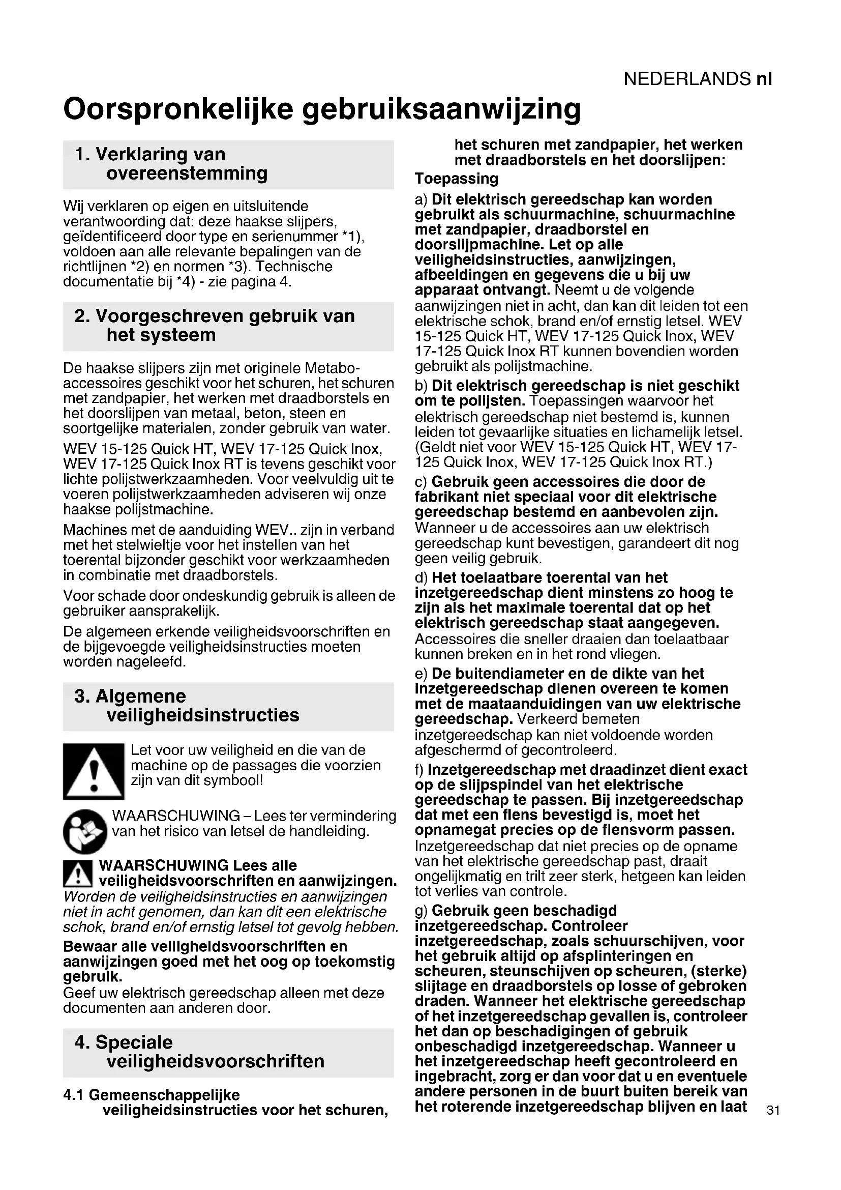 Oorspronkelijke gebruiksaanwijzing Wij verklaren op eigen en uitsluitende verantwoording dat: deze haakse slijpers, geïdentificeerd door type en serienummer *1), voldoen aan alle relevante bepalingen van de richtlijnen *2) en normen *3). Technische documentatie bij *4) - zie pagina 4. De haakse slijpers zijn met originele Metabo- accessoires geschikt voor het schuren, het schuren met zandpapier, het werken met draadborstels en het doorslijpen van metaal, beton, steen en soortgelijke materialen, zonder gebruik van water. WEV 15-125 Quick HT, WEV 17-125 Quick Inox, WEV 17-125 Quick Inox RT is tevens geschikt voor lichte polijstwerkzaamheden. Voor veelvuldig uit te voeren polijstwerkzaamheden adviseren wij onze haakse polijstmachine. Machines met de aanduiding WEV.. zijn in verband met het stelwieltje voor het instellen van het toerental bijzonder geschikt voor werkzaamheden in combinatie met draadborstels. Voor schade door ondeskundig gebruik is alleen de gebruiker aansprakelijk. De algemeen erkende veiligheidsvoorschriften en de bijgevoegde veiligheidsinstructies moeten worden nageleefd. Let voor uw veiligheid en die van de machine op de passages die voorzien zijn van dit symbool! WAARSCHUWING – Lees ter vermindering van het risico van letsel de handleiding. WAARSCHUWING Lees alle veiligheidsvoorschriften en aanwijzingen. Worden de veiligheidsinstructies en aanwijzingen niet in acht genomen, dan kan dit een elektrische schok, brand en/of ernstig letsel tot gevolg hebben. Bewaar alle veiligheidsvoorschriften en aanwijzingen goed met het oog op toekomstig gebruik. Geef uw elektrisch gereedschap alleen met deze documenten aan anderen door.