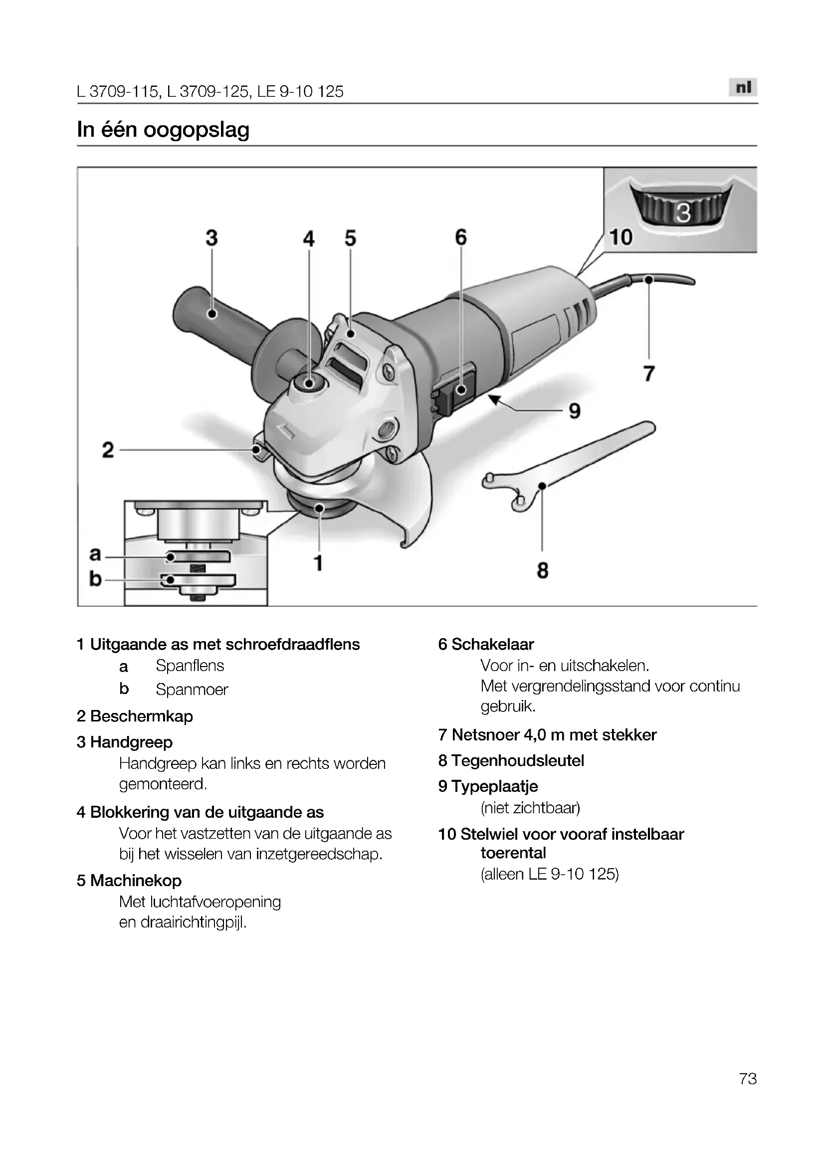 Spanmoer 2 Beschermkap 3 Handgreep Handgreep kan links en rechts worden gemonteerd. 4 Blokkering van de uitgaande as Voor het vastzetten van de uitgaande as bij het wisselen van inzetgereedschap. 5 Machinekop Met luchtafvoeropening en draairichtingpijl. 6 Schakelaar Voor in- en uitschakelen. Met vergrendelingsstand voor continu gebruik. 7 Netsnoer 4,0 m met stekker 8 Tegenhoudsleutel 9 Typeplaatje (niet zichtbaar) 10 Stelwiel voor vooraf instelbaar toerental (alleen LE 9-10 125)L 3709-115, L 3709-125, LE 9-10 125