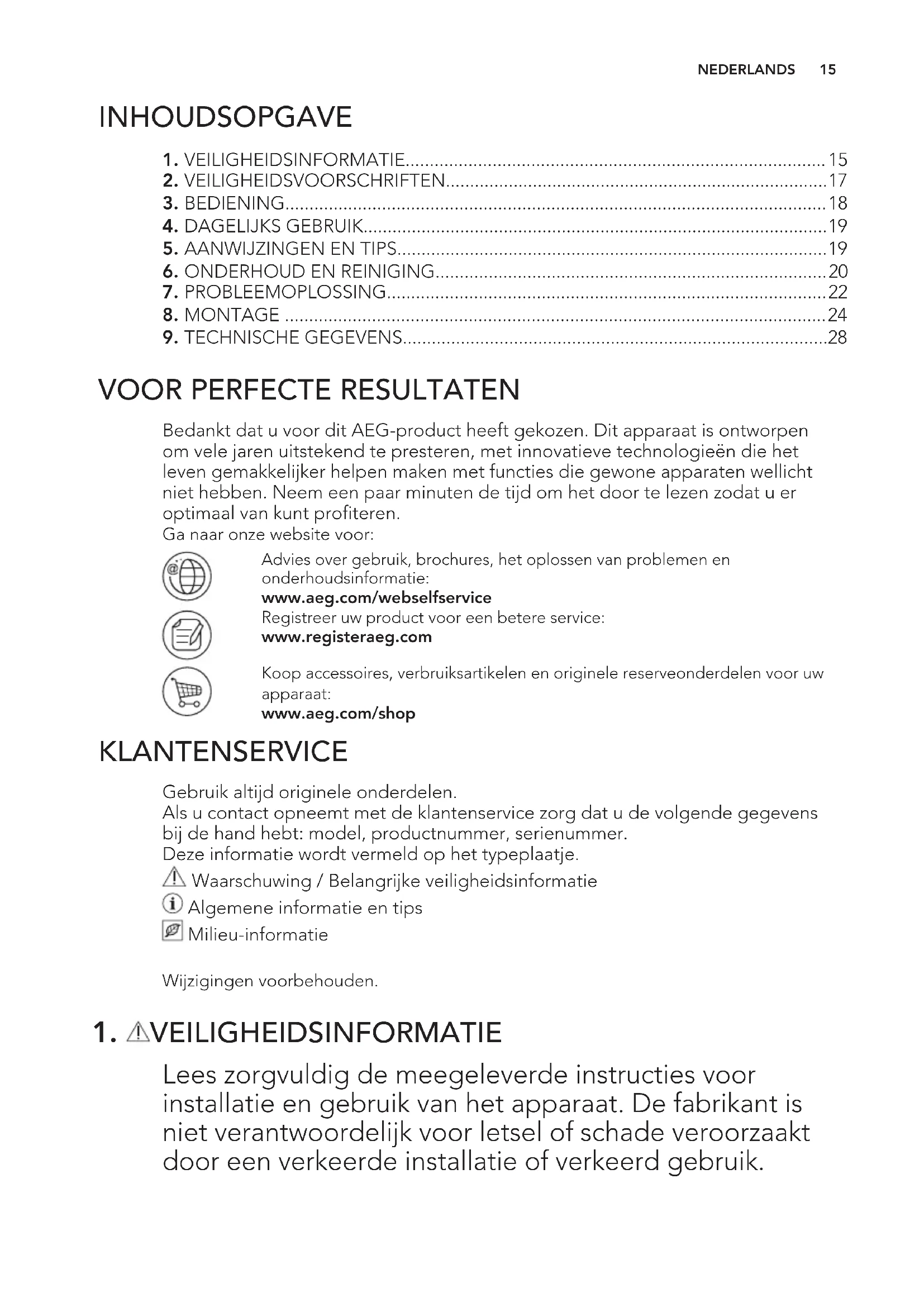 Bedankt dat u voor dit AEG-product heeft gekozen. Dit apparaat is ontworpen om vele jaren uitstekend te presteren, met innovatieve technologieën die het leven gemakkelijker helpen maken met functies die gewone apparaten wellicht niet hebben. Neem een paar minuten de tijd om het door te lezen zodat u er optimaal van kunt profiteren. Ga naar onze website voor: Advies over gebruik, brochures, het oplossen van problemen en onderhoudsinformatie: www.aeg.com/webselfservice Registreer uw product voor een betere service: www.registeraeg.com Koop accessoires, verbruiksartikelen en originele reserveonderdelen voor uw apparaat: www.aeg.com/shop KLANTENSERVICE Gebruik altijd originele onderdelen. Als u contact opneemt met de klantenservice zorg dat u de volgende gegevens bij de hand hebt: model, productnummer, serienummer. Deze informatie wordt vermeld op het typeplaatje. Waarschuwing / Belangrijke veiligheidsinformatie Algemene informatie en tips Milieu-informatie Wijzigingen voorbehouden.