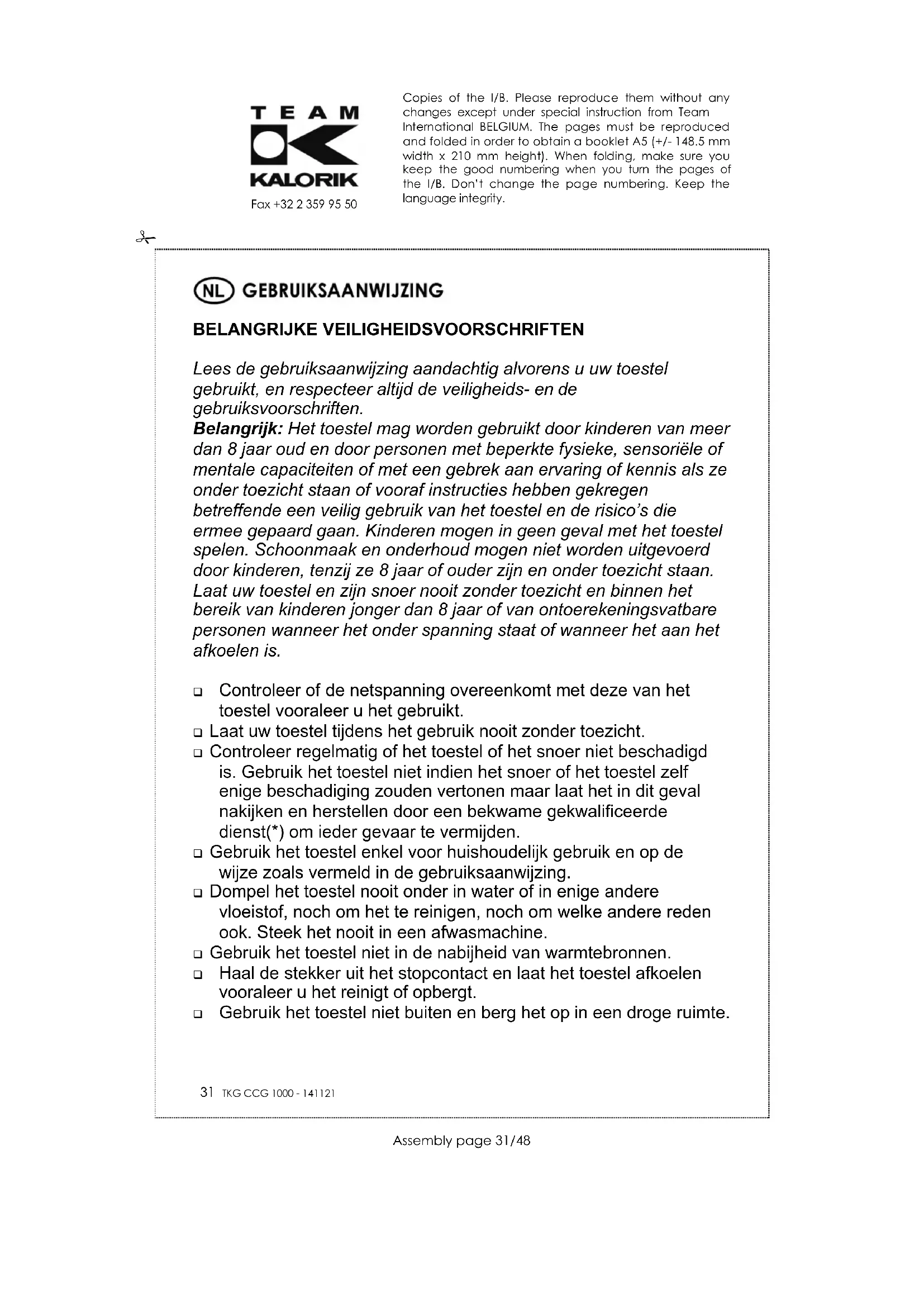 GEBRUIKSAANWIJZING TKG CCG 1000 KTO KALORIK