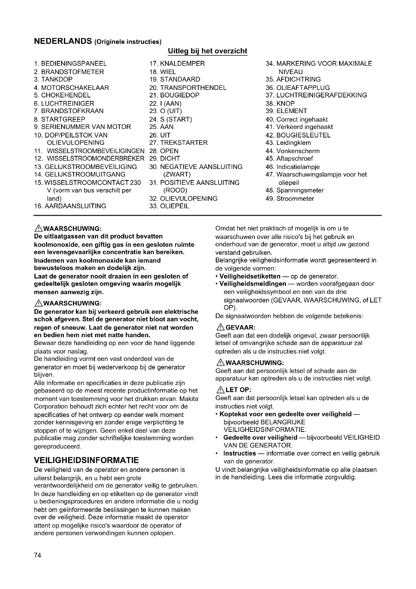 - Gedeelte over veiligheid — bijvoorbeeld VEILIGHEID VAN DE GENERATOR.