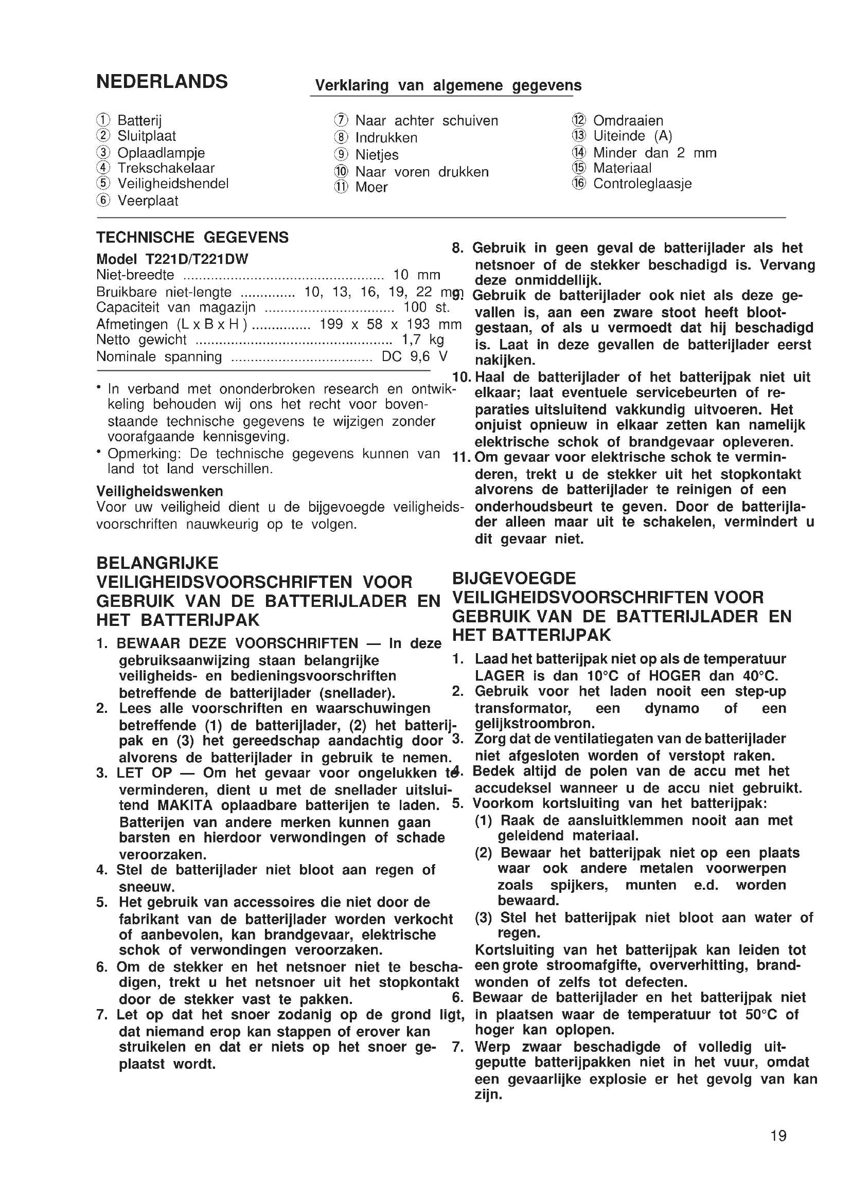 T221D (Nl) (’100. 3. 20)• Wanneer u de batterij van een zojuist gebruikt gereedschap wilt laden, of een batterij die voor langere tijd aan direct zonlicht of hitte werd bloot- gesteld, moet u deze eerst laten afkoelen. Steek daarna de batterij erin en laad hem op.