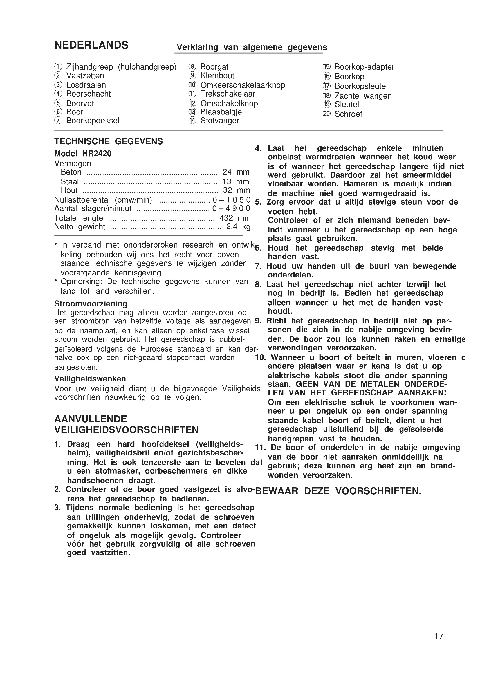 andere plaatsen waar er kans is dat u op elektrische kabels stoot die onder spanning staan, GEEN VAN DE METALEN ONDERDE- LEN VAN HET GEREEDSCHAP AANRAKEN! Om een elektrische schok te voorkomen wan- neer u per ongeluk op een onder spanning staande kabel boort of beitelt, dient u het gereedschap uitsluitend bij de geı¨soleerde handgrepen vast te houden.