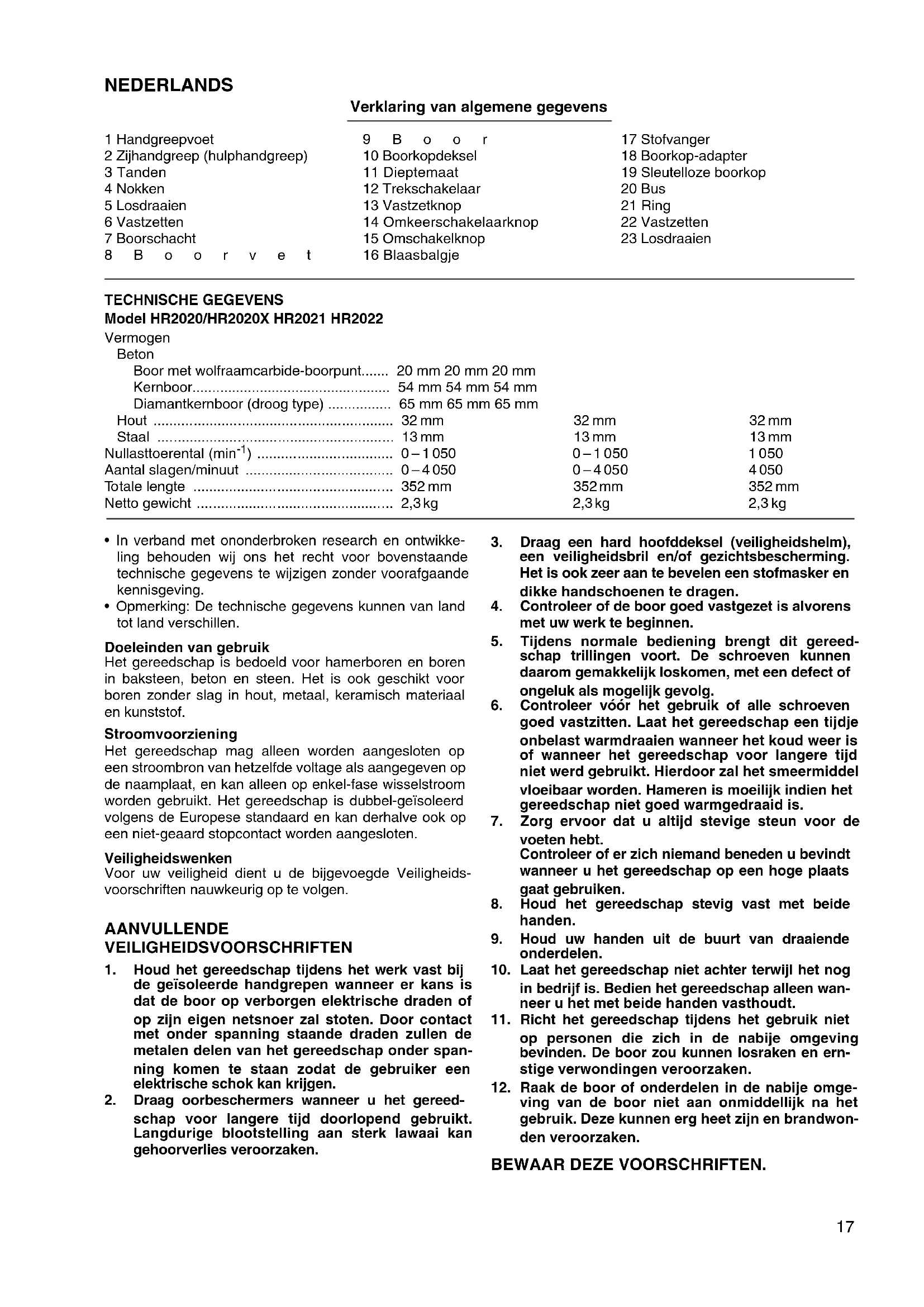- Opmerking: De technische gegevens kunnen van land tot land verschillen. Doeleinden van gebruik Het gereedschap is bedoeld voor hamerboren en boren in baksteen, beton en steen. Het is ook geschikt voor boren zonder slag in hout, metaal, keramisch materiaal en kunststof. Stroomvoorziening Het gereedschap mag alleen worden aangesloten op een stroombron van hetzelfde voltage als aangegeven op de naamplaat, en kan alleen op enkel-fase wisselstroom worden gebruikt. Het gereedschap is dubbel-geïsoleerd volgens de Europese standaard en kan derhalve ook op een niet-geaard stopcontact worden aangesloten. Veiligheidswenken Voor uw veiligheid dient u de bijgevoegde Veiligheids- voorschriften nauwkeurig op te volgen. AANVULLENDE VEILIGHEIDSVOORSCHRIFTEN