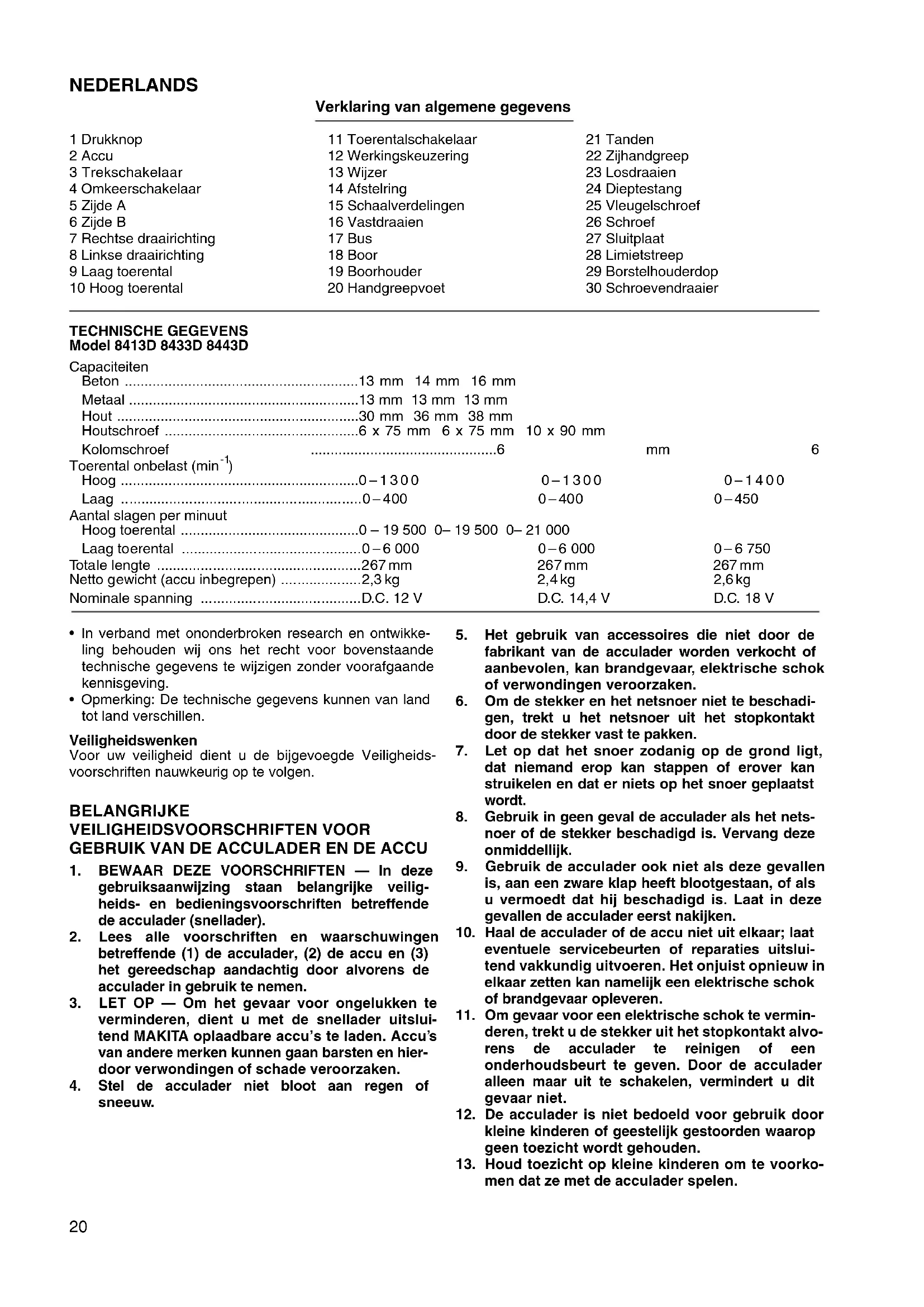 - Indien het gereedschap ononderbroken wordt gebruikt totdat de accu is ontladen, dient u het gereedschap 15 minuten te laten rusten vooraleer met een nieuwe accu verder te werken. Hamerboren Draai eerst de werkingskeuzering zodat de wijzer op het gereedschap naar de X markering wijst. Voor deze wer- king kunt u de afstelring voor het draaimoment op een willekeurig cijfer instellen. Zet de boor op de plaats waar u een gat wilt boren, en druk de trekschakelaar in. For- ceer het gereedschap niet. Lichte druk geeft de beste resultaten. Houd het gereedschap goed op zijn plaats om te voorkomen dat de boor uit het boorgat wegslipt. Oefen geen grotere druk uit wanneer het boorgat met spaan- ders en boorafval verstopt raakt. Laat in zo’n geval het gereedschap onbelast draaien en verwijder de boor gedeeltelijk uit het boorgat. Herhaal dit een aantal keer. Het boorgat zal schoongemaakt worden zodat u weer normaal kunt boren. LET OP: Een enorme draaikracht wordt plotseling uitgeoefend op het gereedschap en op de boor wanneer de boor uit het gat te voorschijn komt, of wanneer het boorgat verstopt raakt met spaanders en boorafval, of wanneer de boor op wapeningsstangen in het beton stoot. Gebruik daarom altijd de zijhandgreep (hulphandgreep) en houd het gereedschap tijdens het gebruik zowel bij de zijhand- greep als bij de schakelhandgreep vast. Als u dit niet doet, kunt u de controle over het gereedschap verliezen, hetgeen ernstige verwonding kan veroorzaken. Blaasbalgje (Fig. 12) Gebruik het blaasbalgje om het boorgat schoon te maken. Installeren van de sluitplaat (Fig. 13) Voor 8413D Installeer altijd de sluitplaat wanneer u accus 1200, 1202 of 1202A gebruikt. Gebruik de bijgeleverde schroef om de sluitplaat aan het gereedschap te bevestigen. ONDERHOUD LET OP: Controleer altijd of de machine is uitgeschakeld en de accu is losgekoppeld vooraleer onderhoud uit te voeren aan de machine. Vervangen van koolborstels (Fig. 14 en 15) Vervang de borstels wanneer ze tot aan de aangegeven limiet zijn afgesleten. Beide koolborstels dienen tegelij- kertijd te worden vervangen. Opdat het gereedschap veilig en betrouwbaar blijft, die- nen alle reparaties, onderhoud of afstellingen te worden uitgevoerd bij een erkend Makita service centrum.24 ESPAÑOL Explicación de los dibujos 1 Botón pulsador 2 Cartucho de baterías 3 Interruptor de gatillo 4 Conmutador de inversión 5 Lado A 6 Lado B 7 Rotación hacia la derecha 8 Rotación hacia la izquierda 9 Baja velocidad 10 Alta velocidad 11 Palanca de cambio de veloci- dad 12 Anillo de cambio del modo de accionamiento 13 Flecha 14 Anillo de ajuste 15 Graduaciones 16 Apretar 17 Mandril 18 Implemento de atornillar 19 Portador de implemento de atornillar 20 Base de agarre 21 Dientes 22 Agarradera lateral 23 Aflojar 24 Varilla de profundidad 25 Tornillo de apriete manual 26 Tornillo 27 Placa de fijación 28 Marca de límite 29 Tapa del portaescobillas 30 Destornillador ESPECIFICACIONES Modelo 8413D 8433D 8443D Capacidades Hormigón .....................................................13 mm 14 mm 16 mm Acero ...........................................................13 mm 13 mm 13 mm Madera ........................................................30 mm 36 mm 38 mm Tornillo para madera ....................................6 x 75 mm 6 x 75 mm 10 x 90 mm Tornillo para máquina ..................................6 mm 6 mm 6 mm Velocidad en vacío (min