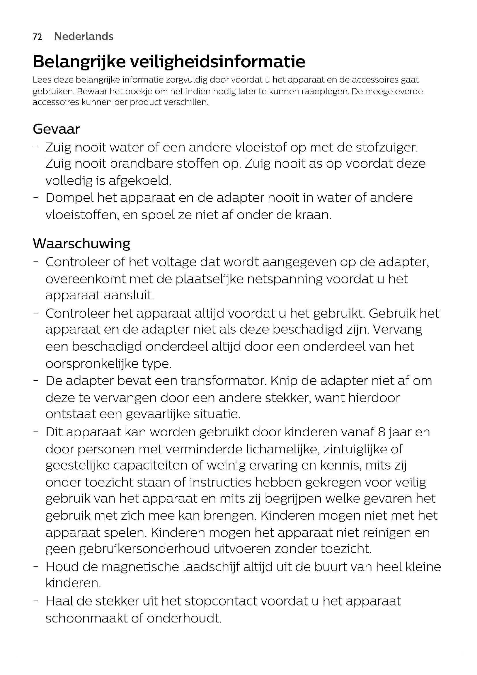Zuig nooit water of een andere vloeistof op met de stofzuiger. Zuig nooit brandbare stoffen op. Zuig nooit as op voordat deze volledig is afgekoeld.