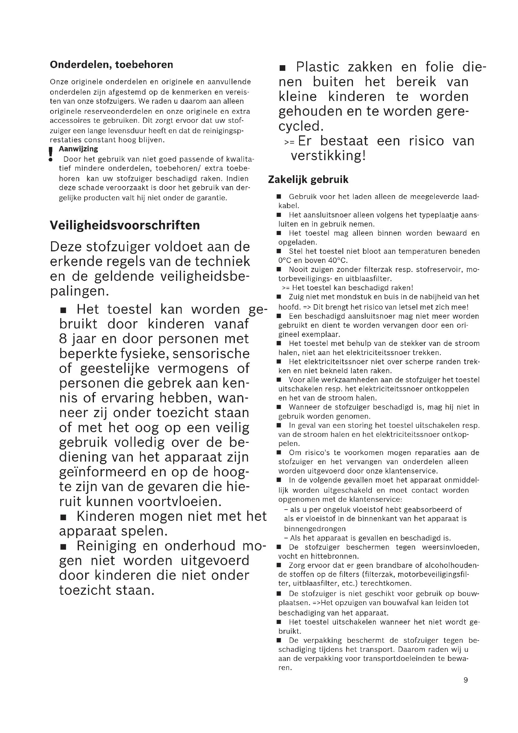 ) finché la batteria non si sarà completamente scaricata. Svitare le viti dell'alloggiamento e prelevare il guscio di copertura per prelevare la batteria. Per evitare un cortocircuito, separare uno dopo l'altro i terminali sulla batteria e isolare immediata- mente i poli. Anche se completamente scariche, le batterie con- tengono ancora una carica residua che può essere rilasciata in caso di cortocircuito.9 Onderdelen, toebehoren Onze originele onderdelen en originele en aanvullende onderdelen zijn afgestemd op de kenmerken en vereis-ten van onze stofzuigers. We raden u daarom aan alleen originele reserveonderdelen en onze originele en extra accessoires te gebruiken. Dit zorgt ervoor dat uw stof-zuiger een lange levensduur heeft en dat de reinigingsp-restaties constant hoog blijven. Aanwijzing Door het gebruik van niet goed passende of kwalita-tief mindere onderdelen, toebehoren/ extra toebe-horen kan uw stofzuiger beschadigd raken. Indien deze schade veroorzaakt is door het gebruik van der-gelijke producten valt hij niet onder de garantie. Veiligheidsvoorschriften Deze stofzuiger voldoet aan de erkende regels van de techniek en de geldende veiligheidsbe- palingen. Het toestel kan worden ge- bruikt door kinderen vanaf 8 jaar en door personen met beperkte fysieke, sensorische of geestelijke vermogens of personen die gebrek aan ken- nis of ervaring hebben, wan- neer zij onder toezicht staan of met het oog op een veilig gebruik volledig over de be- diening van het apparaat zijn geïnformeerd en op de hoog- te zijn van de gevaren die hie- ruit kunnen voortvloeien. Kinderen mogen niet met het apparaat spelen. Reiniging en onderhoud mo- gen niet worden uitgevoerd door kinderen die niet onder toezicht staan. Plastic zakken en folie die- nen buiten het bereik van kleine kinderen te worden gehouden en te worden gere- cycled. >= Er bestaat een risico van verstikking! Zakelijk gebruik Gebruik voor het laden alleen de meegeleverde laad-kabel. Het aansluitsnoer alleen volgens het typeplaatje aans-luiten en in gebruik nemen. Het toestel mag alleen binnen worden bewaard en opgeladen. Stel het toestel niet bloot aan temperaturen beneden 0°C en boven 40°C. Nooit zuigen zonder filterzak resp. stofreservoir, mo-torbeveiligings- en uitblaasfilter.>= Het toestel kan beschadigd raken! Zuig niet met mondstuk en buis in de nabijheid van het hoofd. => Dit brengt het risico van letsel met zich mee! Een beschadigd aansluitsnoer mag niet meer worden gebruikt en dient te worden vervangen door een ori-gineel exemplaar. Het toestel met behulp van de stekker van de stroom halen, niet aan het elektriciteitssnoer trekken. Het elektriciteitssnoer niet over scherpe randen trek-ken en niet bekneld laten raken. Voor alle werkzaamheden aan de stofzuiger het toestel uitschakelen resp. het elektriciteitssnoer ontkoppelen en het van de stroom halen. Wanneer de stofzuiger beschadigd is, mag hij niet in gebruik worden genomen. In geval van een storing het toestel uitschakelen resp. van de stroom halen en het elektriciteitssnoer ontkop-pelen. Om risico's te voorkomen mogen reparaties aan de stofzuiger en het vervangen van onderdelen alleen worden uitgevoerd door onze klantenservice. In de volgende gevallen moet het apparaat onmiddel-lijk worden uitgeschakeld en moet contact worden opgenomen met de klantenservice: − als u per ongeluk vloeistof hebt geabsorbeerd of als er vloeistof in de binnenkant van het apparaat is binnengedrongen − Als het apparaat is gevallen en beschadigd is. De stofzuiger beschermen tegen weersinvloeden, vocht en hittebronnen. Zorg ervoor dat er geen brandbare of alcoholhouden-de stoffen op de filters (filterzak, motorbeveiligingsfil-ter, uitblaasfilter, etc.) terechtkomen. De stofzuiger is niet geschikt voor gebruik op bouw-plaatsen. =>Het opzuigen van bouwafval kan leiden tot beschadiging van het apparaat. Het toestel uitschakelen wanneer het niet wordt ge-bruikt. De verpakking beschermt de stofzuiger tegen be-schadiging tijdens het transport. Daarom raden wij u aan de verpakking voor transportdoeleinden te bewa- ren.10 Accu'sUw toestel is uitgerust met Lithium-ion accu's. Vanwege de veiligheid zijn deze alleen toegankelijk voor vaklui die bevoegd zijn tot het uitvoeren van reparaties.Neem voor vervanging van de accu's contact op met de dichtstbijzijnde klantenservice of een geautoriseerde dealer. Aanwijzingen voor het transportDe ontvangen Lithium-ion accu's voldoen aan de wet-telijke voorschriften voor het transport van gevaarlijke stoffen.De accu's kunnen door de gebruiker zonder verdere voorschriften over straat getransporteerd worden. Bij verzending door derden (bijv. luchttransport of een expeditiebedrijf) dienen bijzondere eisen ten aanzien van de verpakking en het transport in acht te worden genomen. Hier moet bij de voorbereiding van het verzendstuk een expert op het gebied van gevaarlijke stoffen worden geraadpleegd. Aanwijzingen voor recycling Stofzuigers, accu's, accessoires en verpakkingen dienen op milieuvriendelijke wijze te worden afgevoerd.Geef stofzuigers en accu's niet mee met het huisvuil! Verpakking De verpakking beschermt de stofzuiger tegen be-schadiging tijdens het transport. Deze bestaat uit milieuvriendelijk materiaal en is daarom recycle-baar. Breng verpakkingsmateriaal dat u niet meer nodig heeft naar een verzamelplaats voor de verwer-king van afval. Oude apparaten Dit toestel bevat herlaadbare Lithium-ion accu's. Daarom mag het alleen via de geautoriseerde klan-tenservice en de dealer worden afgevoerd. Accu's / Batterijen Neem de aanwijzingen voor het transport in acht. Geïntegreerde accu's mogen met het oog op de af-voerverwerking alleen worden verwijderd door ge-schoold personeel. Door het openen van de behui-zing kan de stofzuiger onklaar worden gemaakt. Om de accu uit de stofzuiger te verwijderen, drukt u zolang op de aan-/uitschakelaar (Afb. ) tot de accu volledig ontladen is. Draai de schroeven uit de behuizing en neem dit behuizingsdeel af om de accu te verwijdere