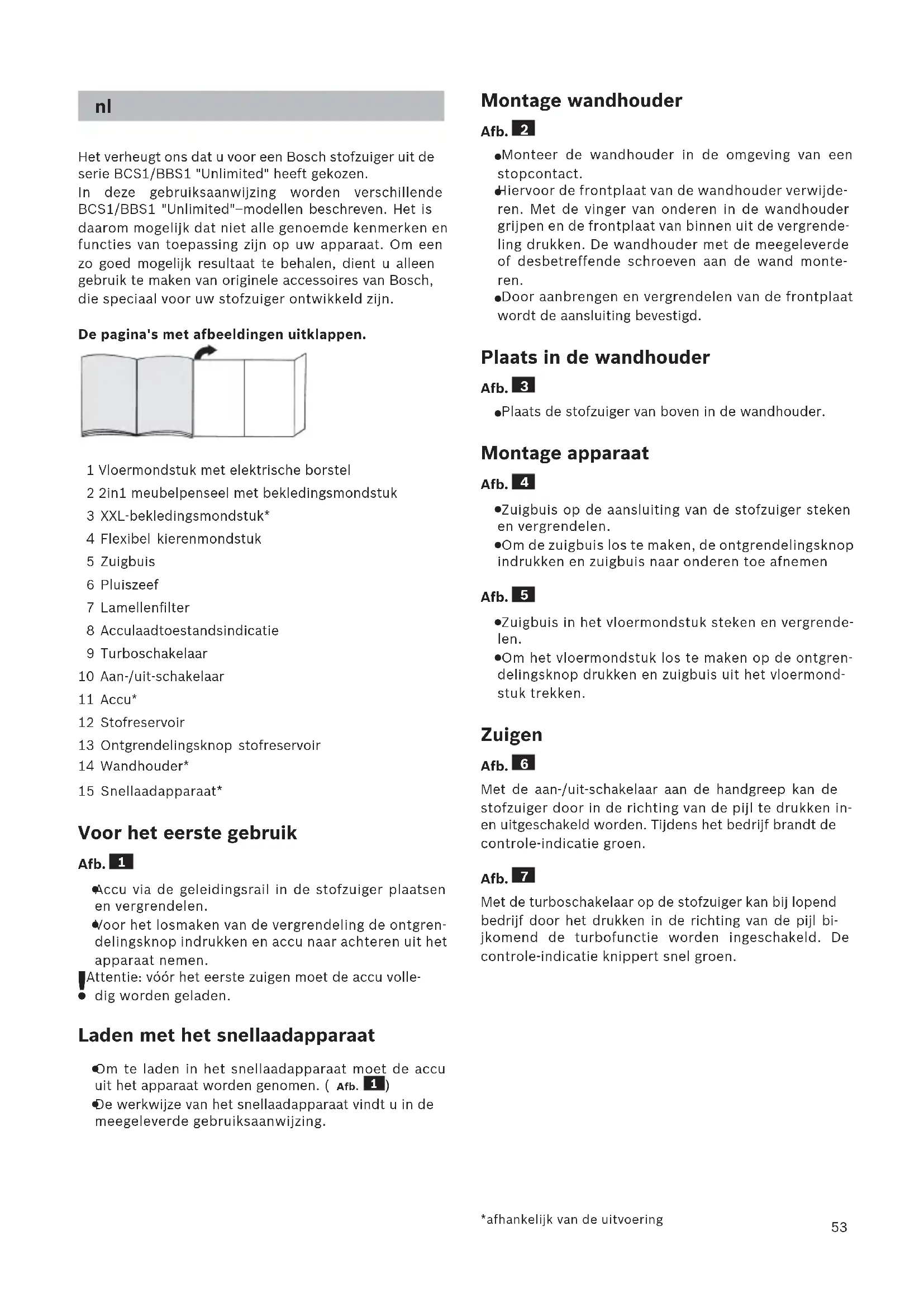 - a seconda della specifica dotazione53 Het verheugt ons dat u voor een Bosch stofzuiger uit de serie BCS1/BBS1 "Unlimited" heeft gekozen. In deze gebruiksaanwijzing worden verschillende BCS1/BBS1 "Unlimited"–modellen beschreven. Het is daarom mogelijk dat niet alle genoemde kenmerken en functies van toepassing zijn op uw apparaat. Om een zo goed mogelijk resultaat te behalen, dient u alleen gebruik te maken van originele accessoires van Bosch, die speciaal voor uw stofzuiger ontwikkeld zijn. De pagina's met afbeeldingen uitklappen. 1 Vloermondstuk met elektrische borstel 2 2in1 meubelpenseel met bekledingsmondstuk 3 XXL-bekledingsmondstuk* 4 Flexibel kierenmondstuk 5 Zuigbuis 6 Pluiszeef 7 Lamellenfilter 8 Acculaadtoestandsindicatie 9 Turboschakelaar 10 Aan-/uit-schakelaar 11 Accu* 12 Stofreservoir 13 Ontgrendelingsknop stofreservoir 14 Wandhouder* 15 Snellaadapparaat* Voor het eerste gebruik Afb.