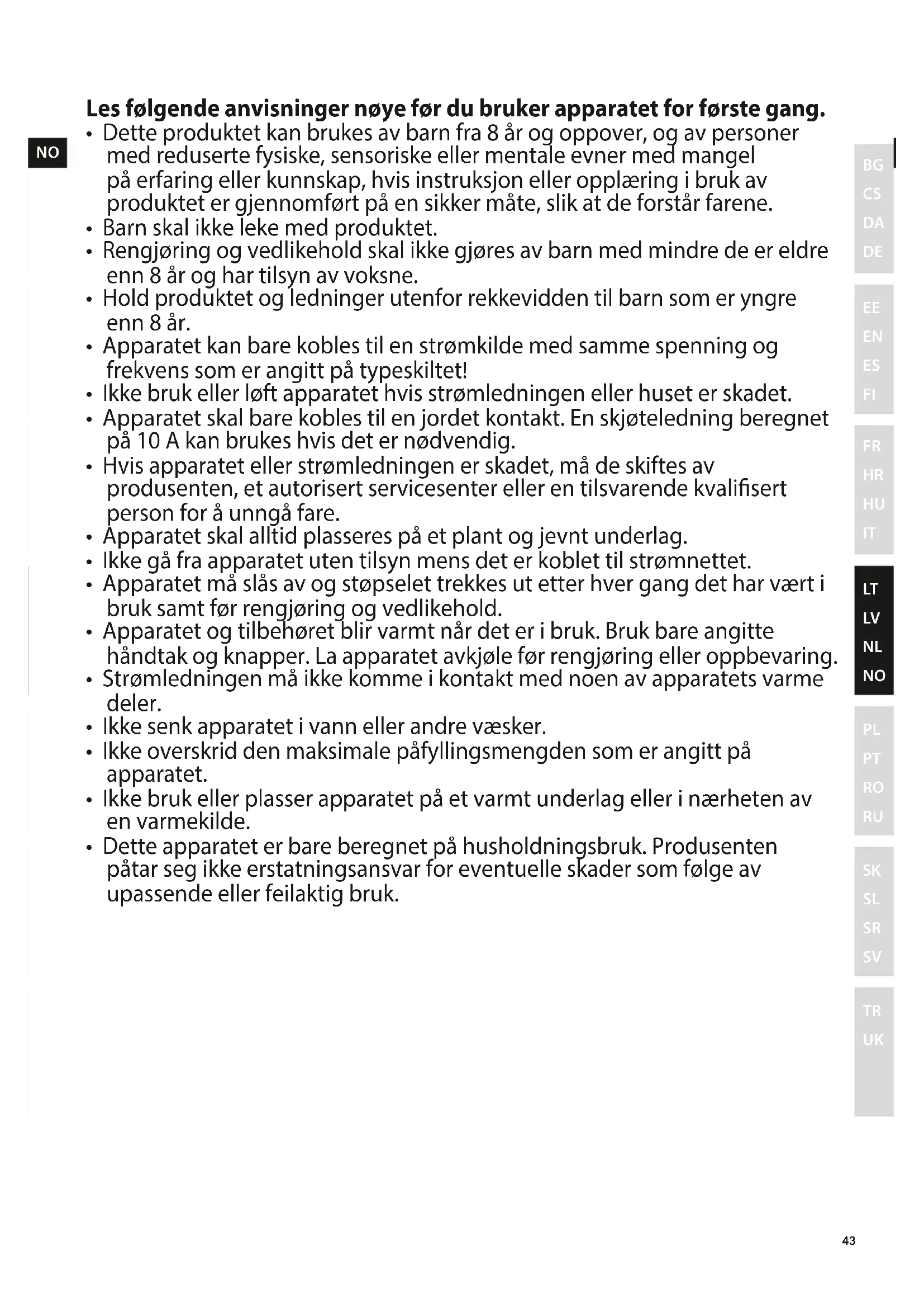- Dit apparaat is enkel bedoeld voor huishoudelijk gebruik. De fabrikant aanvaardt geen aansprakelijkheid voor mogelijke schade die het gevolg is van onjuist gebruik.NO