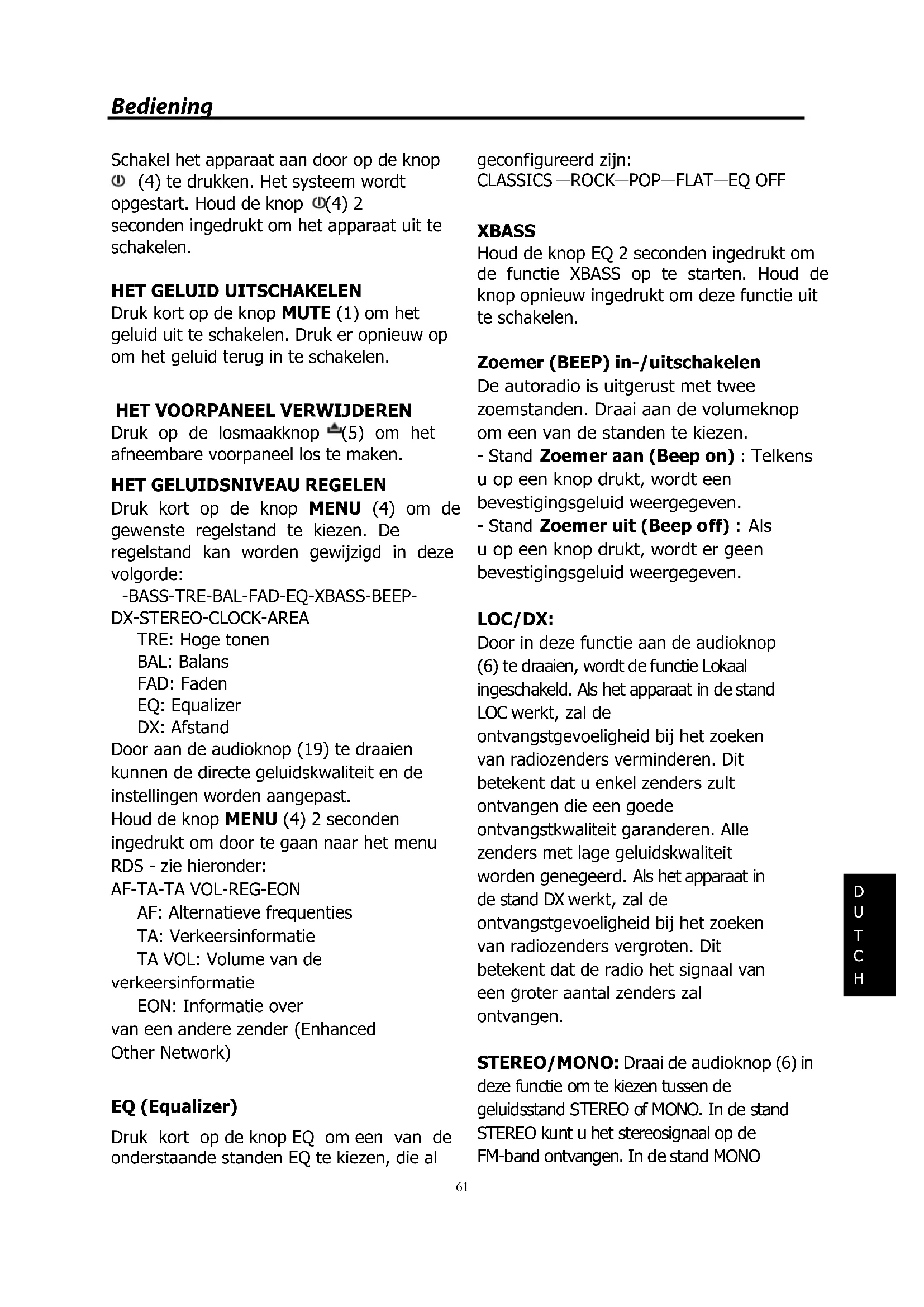 nummerknop opgeslagen in het geheugen. Druk kort op de knop van de geprogrammeerde zender (1-6) om naar het signaal te luisteren van de zender die aan dit nummer is toegeschreven. RDS (RADIO DATA SYSTEM) BEDIENEN De stand RDS kan worden ingesteld in de stand AF in het systeemmenu. Draai aan de audioknop om de functie AF in of uit te schakelen. Telkens de functie AF wordt ingeschakeld, verschijnt het symbool „AF” op de display. De naam van het programma wordt weergegeven, wanneer er een RDS-station wordt ontvangen. Het symbool „AF” begint te knipperen als als de kwaliteit van het signaal verslechtert. Op het moment dat er een noodsignaal wordt ontvangen, verschijnt het bericht „ALARM” op de display, en het volume van de uitzending wordt automatisch aangepast aan het ingestelde geluidsniveau, als de volumecontrole is ingesteld op het minimumniveau. Regionale programma’s bedienen Dit is mogelijk in de stand REG in het systeemmenu, als de functie AF is ingeschakeld. Door aan de audioknop te draaien kunt u de functie REG in- of uitschakelen. Als de functie AF is uitgeschakeld, kan de functie REG niet worden uitgeschakeld. Bepaalde zendstations veranderen soms voor bepaalde tijd hun programma van normale uitzending naar regionale uitzending. Als de functie regionaal is ingeschakeld, zal het programma dat op dat moment wordt beluisterd, niet worden gewijzigd. Nadat de functie regionaal is uitgeschakeld, kunt u overgaan naar een ontvangstsignaal dat wordt uitgezonden door een regionale zender. Verkeersinformatie beluisteren Door aan de audioknop te draaien in de stand TA in het systeemmenu kunt u de functie TA in- of uitschakelen. Door de stand TA in te schakelen kunt u verkeersinformatie ontvangen. Als het apparaat werkt in de stand CD (MP3) of AUX, wordt er tijdelijk overgeschakeld in radiostand. Als de functie EON verkeersinformatie detecteert in een ander programma, schakelt het apparaat tijdelijk over naar de zender die met de functie EON is verbonden. Als het volume onder de drempelwaarde ligt, wordt het verhoogd tot die waarde. Door de stand TA in te schakelen, wordt de functie TA ingeschakeld voor één segment. Op het moment dat er een signaal van een TP-zender wordt ontvangen, wordt de functie TP opgestart voor dat bepaald segment. Functie TA verstoren Door de functie TA over te schakelen naar STOP wordt de ontvangst van verkeersinformatie geannuleerd (stand TA in het menu RDS – mogelijke gevallen: enkel aan/uit, als er geen enkele TA-zender wordt ontvangen. Wanneer er een TA-station wordt ontvangen, verschijnen de opties aan/stop/uit in de gepaste stand TA in het menu). Hierdoor wordt de stand TA echter niet uitgeschakeld. Er kan ongewild worden overgeschakeld naar de stand EON TA, wanneer de informatie EON TA al werd ontvangen van de zender die op dat moment is gekozen, en de radio overschakelt naar een signaal van deze EON-zender, maar te ver van de EON-zender is om het signaal te ontvangen. In deze situatie wordt de radio terug overgeschakeld naar de zender die op dat momentBediening