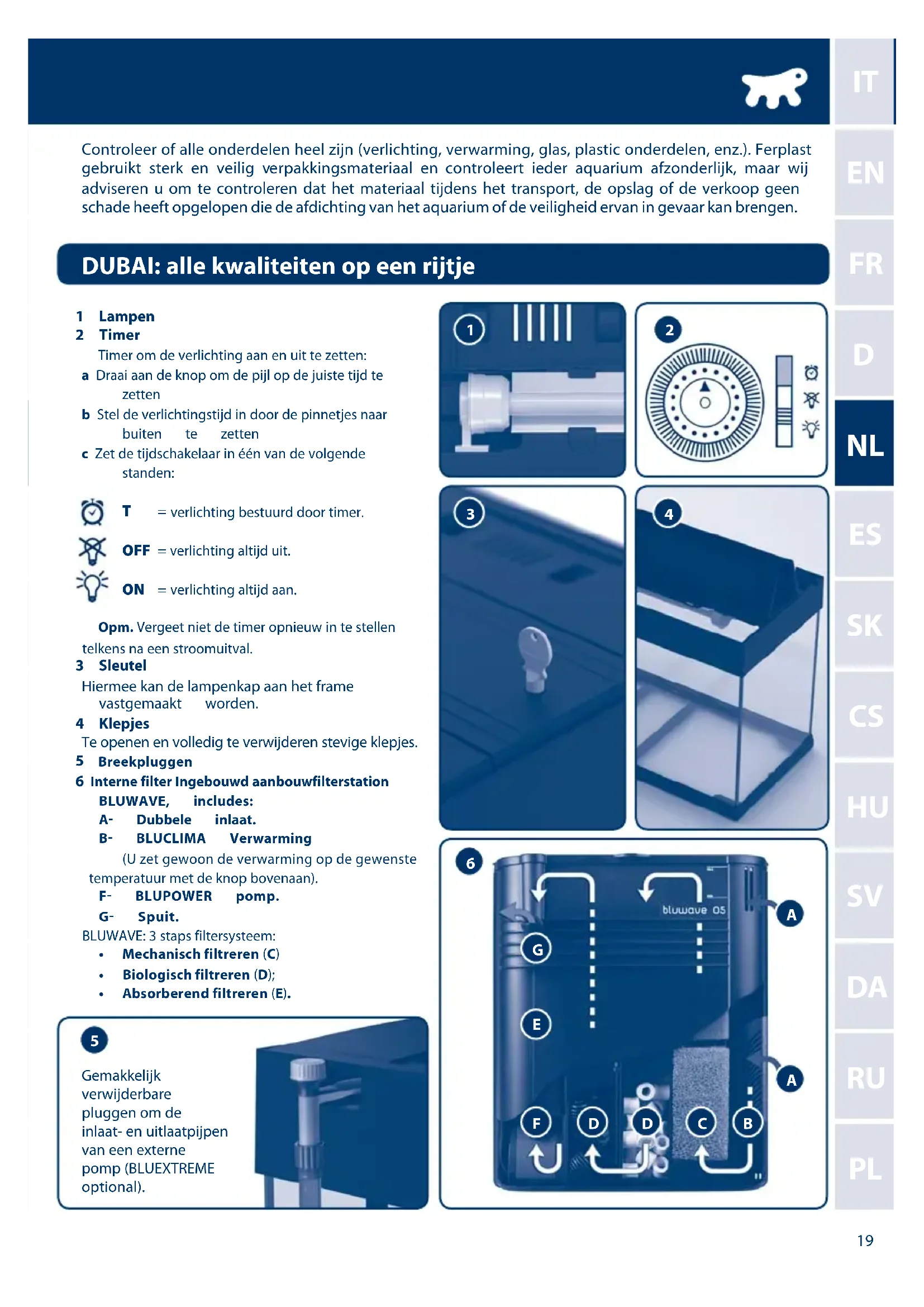 - Laat een lus in de stroomkabel onder het stopcontact als u de stekker in het stopcontact steekt, zodat er geen waterdruppels via de kabel in het stopcontact kunnen komen (7) Het aquarium plaatsen 1 Bevestig de meegeleverde haken aan het BLUWAVE filter (8). 2 Plaats het BLUWAVE binnenfilter op de gewenste plaats (zij- of achterkant) door het te schuiven over de speciale geleiders op het frame (9). 3 Bevestig de lampenkap aan het frame met behulp van de speciale sleutel of een schroevendraaier (10). 4 Controleer of de sluitringen goed op de lampen vastzitten. De DUBAI inrichten