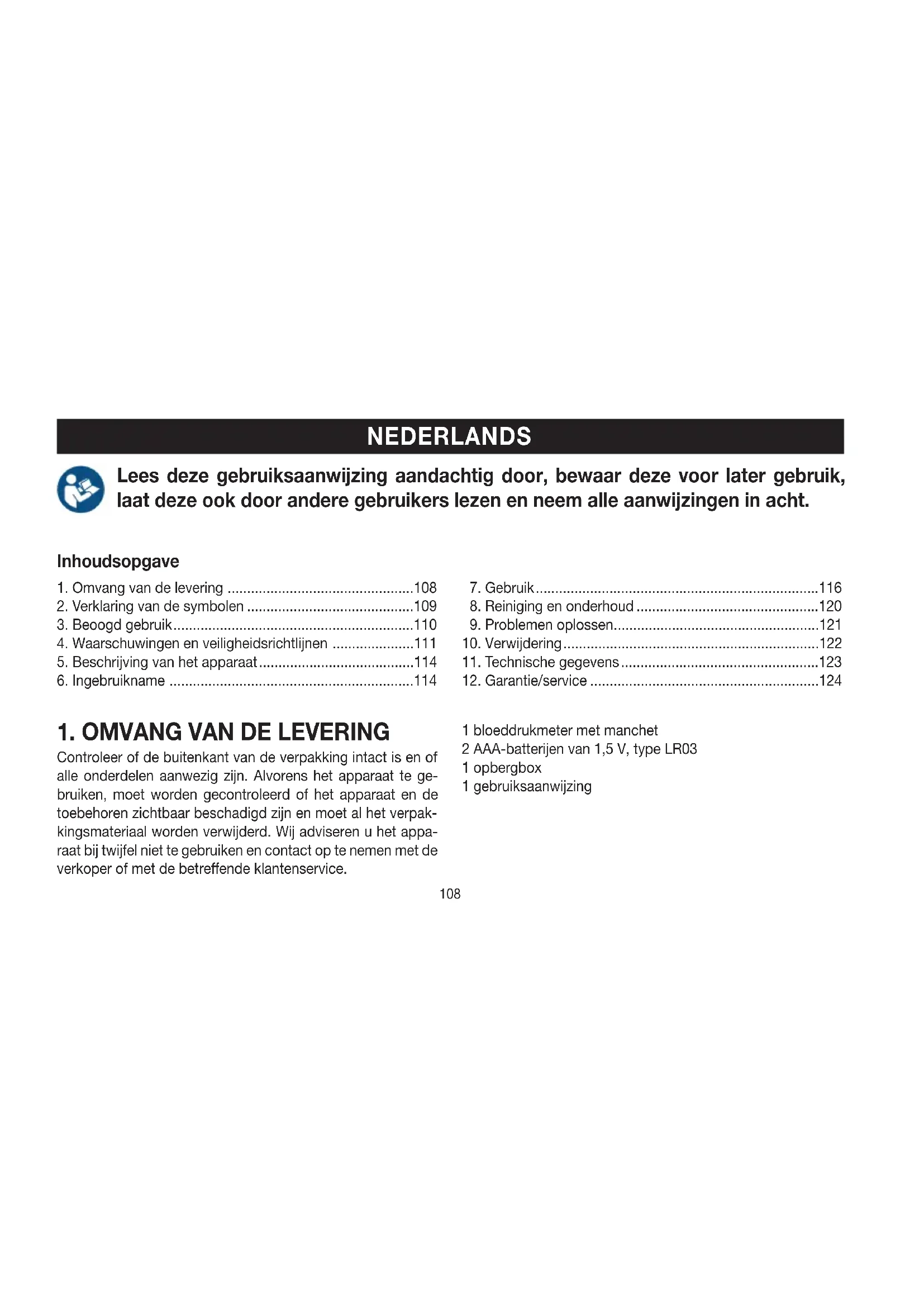 Controleer of de buitenkant van de verpakking intact is en of alle onderdelen aanwezig zijn. Alvorens het apparaat te ge- bruiken, moet worden gecontroleerd of het apparaat en de toebehoren zichtbaar beschadigd zijn en moet al het verpak- kingsmateriaal worden verwijderd. Wij adviseren u het appa- raat bij twijfel niet te gebruiken en contact op te nemen met de verkoper of met de betreende klantenservice. 1 bloeddrukmeter met manchet 2 AAA-batterijen van 1,5 V, type LR03 1 opbergbox 1 gebruiksaanwijzing