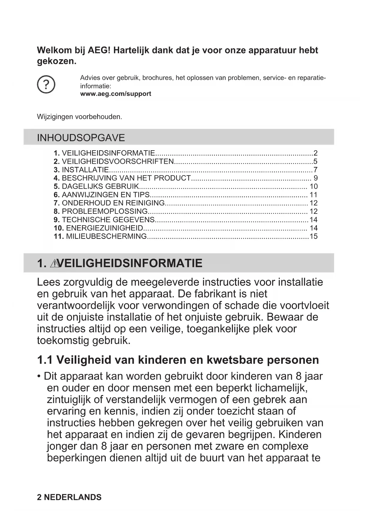 Recycleer de materialen met het symbool . Gooi de verpakking in een geschikte afvalcontainer om het te recycleren. Bescherm het milieu en de volksgezondheid en recycleer op een correcte manier het afval van elektrische en elektronische apparaten. Gooi apparaten gemarkeerd met het symbool niet weg met het huishoudelijk afval. Breng het product naar het milieustation bij u in de buurt of neem contact op met de gemeente. NEDERLANDS 15Bienvenue chez AEG ! Nous vous remercions d’avoir choisi l’un de nos appareils. Obtenir des conseils d’utilisation, des brochures, un dépanneur, des informations surle service et les réparations :www.aeg.com/supportSous réserve de modifications.