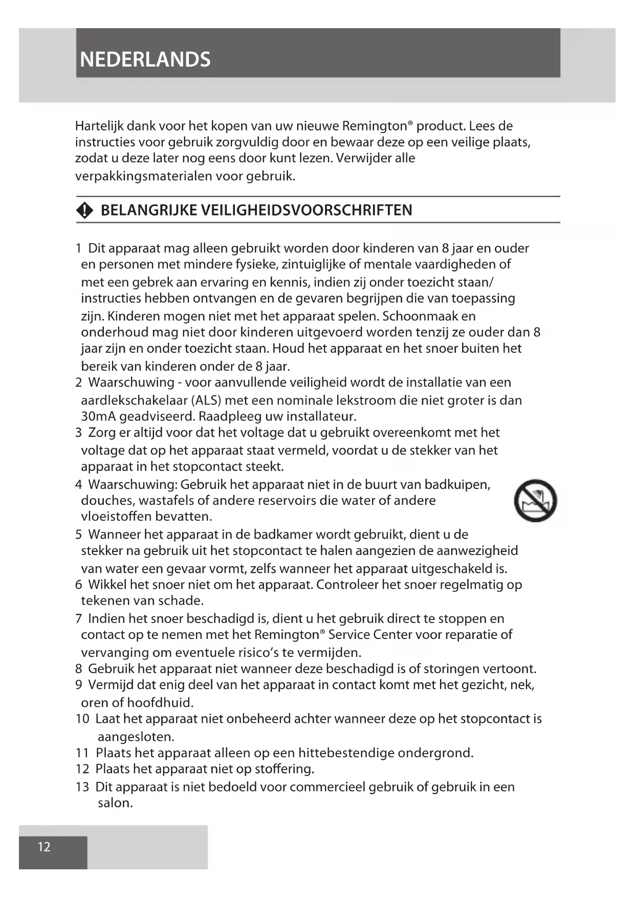 1 Dit apparaat mag alleen gebruikt worden door kinderen van 8 jaar en ouder en personen met mindere fysieke, zintuiglijke of mentale vaardigheden of met een gebrek aan ervaring en kennis, indien zij onder toezicht staan/ instructies hebben ontvangen en de gevaren begrijpen die van toepassing zijn. Kinderen mogen niet met het apparaat spelen. Schoonmaak en onderhoud mag niet door kinderen uitgevoerd worden tenzij ze ouder dan 8 jaar zijn en onder toezicht staan. Houd het apparaat en het snoer buiten het bereik van kinderen onder de 8 jaar. 2 Waarschuwing - voor aanvullende veiligheid wordt de installatie van een aardlekschakelaar (ALS) met een nominale lekstroom die niet groter is dan 30mA geadviseerd. Raadpleeg uw installateur. 3 Zorg er altijd voor dat het voltage dat u gebruikt overeenkomt met het voltage dat op het apparaat staat vermeld, voordat u de stekker van het apparaat in het stopcontact steekt. 4 Waarschuwing: Gebruik het apparaat niet in de buurt van badkuipen, douches, wastafels of andere reservoirs die water of andere vloeistoffen bevatten. 5 Wanneer het apparaat in de badkamer wordt gebruikt, dient u de stekker na gebruik uit het stopcontact te halen aangezien de aanwezigheid van water een gevaar vormt, zelfs wanneer het apparaat uitgeschakeld is. 6 Wikkel het snoer niet om het apparaat. Controleer het snoer regelmatig op tekenen van schade. 7 Indien het snoer beschadigd is, dient u het gebruik direct te stoppen en contact op te nemen met het Remington® Service Center voor reparatie of vervanging om eventuele risico’s te vermijden. 8 Gebruik het apparaat niet wanneer deze beschadigd is of storingen vertoont. 9 Vermijd dat enig deel van het apparaat in contact komt met het gezicht, nek, oren of hoofdhuid. 10 Laat het apparaat niet onbeheerd achter wanneer deze op het stopcontact is aangesloten. 11 Plaats het apparaat alleen op een hittebestendige ondergrond. 12 Plaats het apparaat niet op stoffering. 13 Dit apparaat is niet bedoeld voor commercieel gebruik of gebruik in een salon.13 NEDERLANDS GBDNLFEIDKSFINPSKCZ HUN PLRUTRROGRSIBG HRUAAE 14 Laat het apparaat afkoelen, voordat deze wordt gereinigd en opgeborgen. 15 WAARSCHUWING: Bevat sporen van noten.