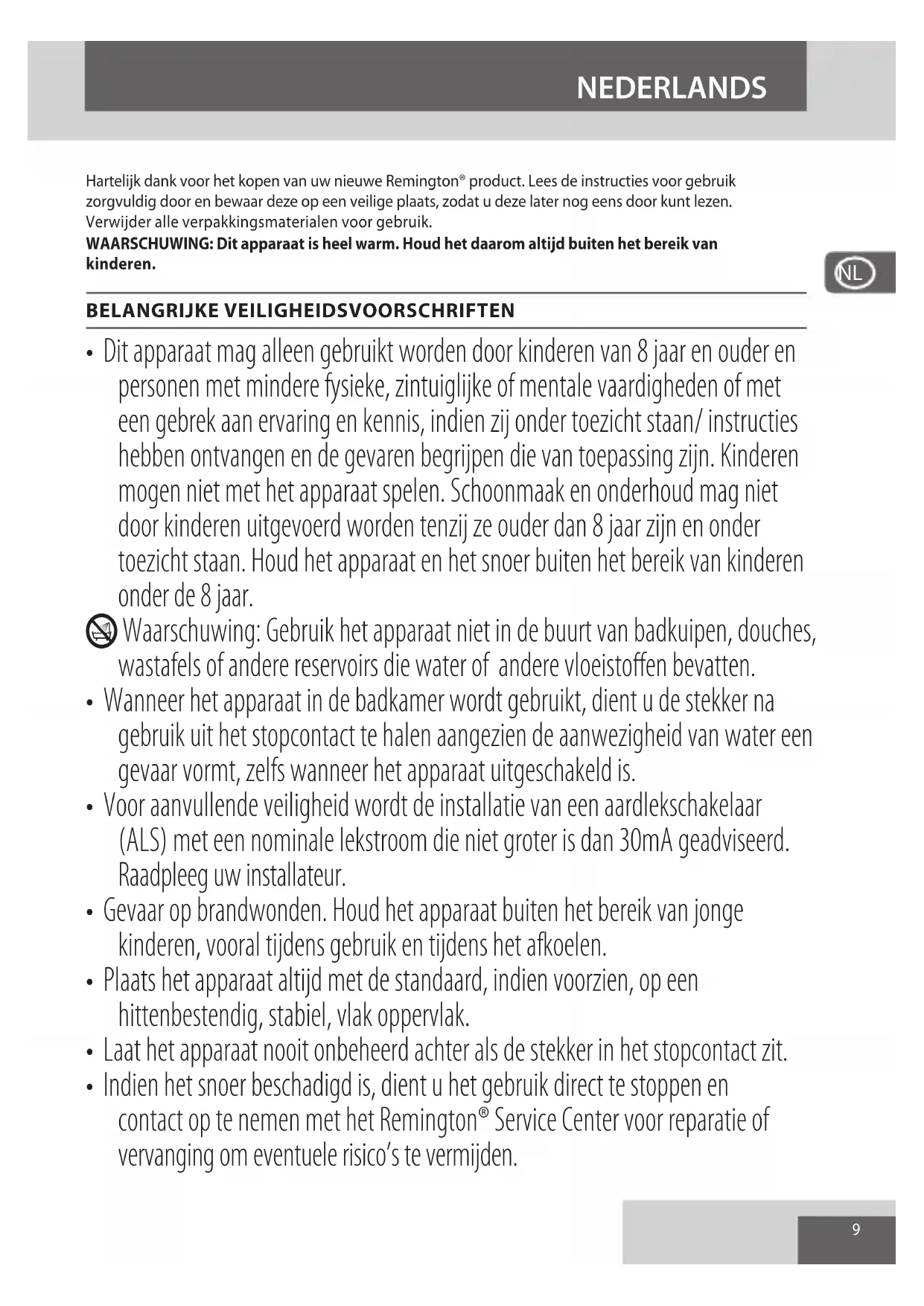 - Indien het snoer beschadigd is, dient u het gebruik direct te stoppen en contact op te nemen met het Remington® Service Center voor reparatie of vervanging om eventuele risico’s te vermijden. NEDERLANDS