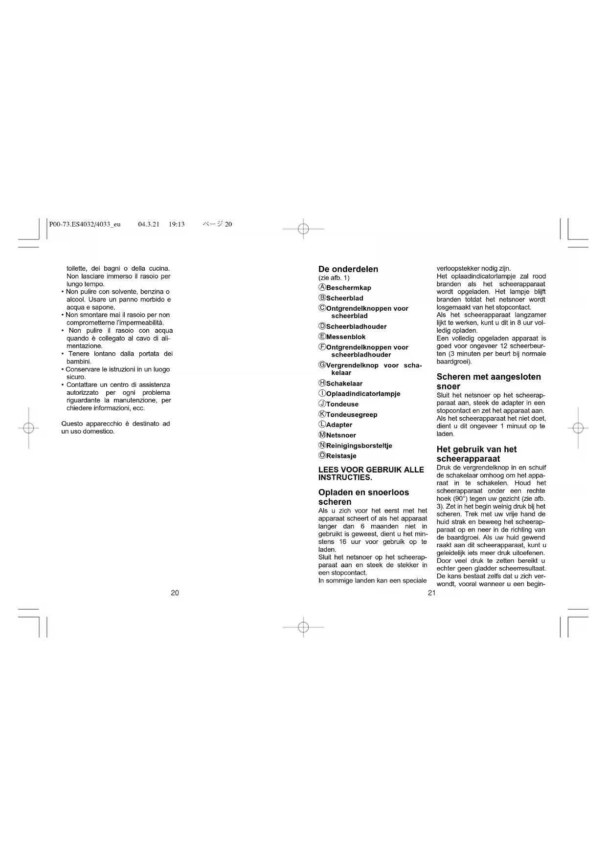P00-73.ES4032/4033eu 04.3.21 19:13 ページ1821 De onderdelen (zie afb. 1) A Beschermkap B Scheerblad C Ontgrendelknoppen voor scheerblad D Scheerbladhouder E Messenblok F Ontgrendelknoppen voor scheerbladhouder G Vergrendelknop voor scha- kelaar H Schakelaar I Oplaadindicatorlampje J Tondeuse K Tondeusegreep L Adapter M Netsnoer N Reinigingsborsteltje O Reistasje