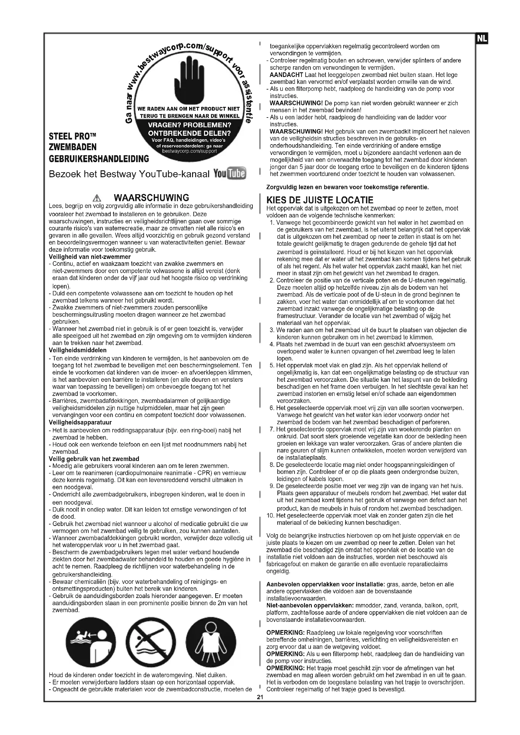 WAARSCHUWING Lees, begrijp en volg zorgvuldig alle informatie in deze gebruikershandleiding vooraleer het zwembad te installeren en te gebruiken. Deze waarschuwingen, instructies en veiligheidsrichtlijnen gaan over sommige courante risico's van waterrecreatie, maar ze omvatten niet alle risico's en gevaren in alle gevallen. Wees altijd voorzichtig en gebruik gezond verstand en beoordelingsvermogen wanneer u van wateractiviteiten geniet. Bewaar deze informatie voor toekomstig gebruik.Veiligheid van niet-zwemmer- Continu, actief en waakzaam toezicht van zwakke zwemmers en niet-zwemmers door een competente volwassene is altijd vereist (denk eraan dat kinderen onder de vijf jaar oud het hoogste risico op verdrinking lopen).- Duid een competente volwassene aan om toezicht te houden op het zwembad telkens wanneer het gebruikt wordt.- Zwakke zwemmers of niet-zwemmers zouden persoonlijke beschermingsuitrusting moeten dragen wanneer ze het zwembad gebruiken.- Wanneer het zwembad niet in gebruik is of er geen toezicht is, verwijder alle speelgoed uit het zwembad en zijn omgeving om te vermijden kinderen aan te trekken naar het zwembad.Veiligheidsmiddelen- Ten einde verdrinking van kinderen te vermijden, is het aanbevolen om de toegang tot het zwembad te beveiligen met een beschermingselement. Ten einde te voorkomen dat kinderen van de invoer- en afvoerkleppen klimmen, is het aanbevolen een barrière te installeren (en alle deuren en vensters waar van toepassing te beveiligen) om onbevoegde toegang tot het zwembad te voorkomen.- Barrières, zwembadafdekkingen, zwembadalarmen of gelijkaardige veiligheidsmiddelen zijn nuttige hulpmiddelen, maar het zijn geen vervangingen voor een continu en competent toezicht door volwassenen.Veiligheidsapparatuur- Het is aanbevolen om reddingsapparatuur (bijv. een ring-boei) nabij het zwembad te hebben.- Houd ook een werkende telefoon en een lijst met noodnummers nabij het zwembad.Veilig gebruik van het zwembad- Moedig alle gebruikers vooral kinderen aan om te leren zwemmen.- Leer om te reanimeren (cardiopulmonaire reanimatie - CPR) en vernieuw deze kennis regelmatig. Dit kan een levensreddend verschil uitmaken in een noodgeval.- Onderricht alle zwembadgebruikers, inbegrepen kinderen, wat te doen in een noodgeval.- Duik nooit in ondiep water. Dit kan leiden tot ernstige verwondingen of tot de dood.- Gebruik het zwembad niet wanneer u alcohol of medicatie gebruikt die uw vermogen om het zwembad veilig te gebruiken, zou kunnen aantasten.- Wanneer zwembadafdekkingen gebruikt worden, verwijder deze volledig uit het wateroppervlak voor u in het zwembad gaat.- Bescherm de zwembadgebruikers tegen met water verband houdende ziekten door het zwembadwater behandeld te houden en goede hygiëne in acht te nemen. Raadpleeg de richtlijnen voor waterbehandeling in de gebruikershandleiding.- Bewaar chemicaliën (bijv. voor waterbehandeling of reinigings- en ontsmettingsproducten) buiten het bereik van kinderen.- Gebruik de aanduidingsborden zoals hieronder aangegeven. Er moeten aanduidingsborden staan in een prominente positie binnen de 2m van het zwembad.Houd de kinderen onder toezicht in de wateromgeving. Niet duiken.- Er moeten verwijderbare ladders staan op een horizontaal oppervlak.- Ongeacht de gebruikte materialen voor de zwembadconstructie, moeten de Bezoek het Bestway YouTube-kanaal STEEL PRO™ ZWEMBADEN GEBRUIKERSHANDLEIDING toegankelijke oppervlakken regelmatig gecontroleerd worden om verwondingen te vermijden.- Controleer regelmatig bouten en schroeven, verwijder splinters of andere scherpe randen om verwondingen te vermijden. AANDACHT Laat het leeggelopen zwembad niet buiten staan. Het lege zwembad kan vervormd en/of verplaatst worden omwille van de wind.- Als u een filterpomp hebt, raadpleeg de handleiding van de pomp voor instructies. WAARSCHUWING! De pomp kan niet worden gebruikt wanneer er zich mensen in het zwembad bevinden!- Als u een ladder hebt, raadpleeg de handleiding van de ladder voor instructies. WAARSCHUWING! Het gebruik van een zwembadkit impliceert het naleven van de veiligheidsin structies beschreven in de gebruiks- en onderhoudshandleiding. Ten einde verdrinking of andere ernstige verwondingen te vermijden, moet u bijzondere aandacht verlenen aan de mogelijkheid van een onverwachte toegang tot het zwembad door kinderen jonger dan 5 jaar door de toegang ertoe te beveiligen en de kinderen tijdens het zwemmen voortdurend onder toezicht te houden van volwassenen. Zorgvuldig lezen en bewaren voor toekomstige referentie.