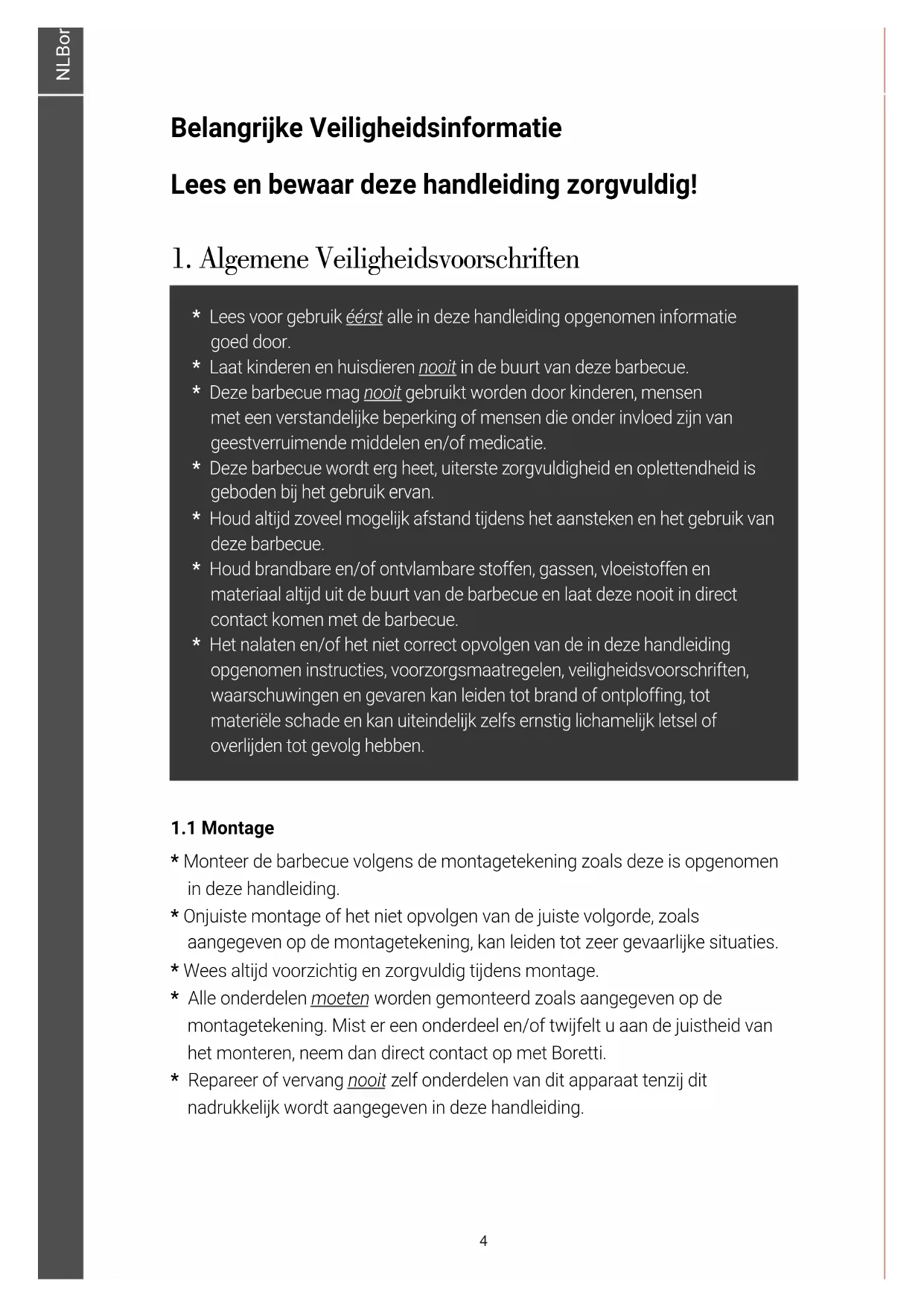 - This barbecue features the mark that complies with the European guidelines 2002/96EG relating to disposal of equipment. This guideline decides the standard for the collection and recycling of disposed equipment which apply to the whole European Union territory. For barbecue accessories warranty service conditions and other questions we refer you to www.boretti.com You can also send questions and suggestions to info@boretti.com BARILO DK | BRUGANVISNING www.boretti.com 16BARILO NL | GEBRUIKSAANWIJZING www.boretti.comNLBoretti Barilo / Handleiding - Installatie advies Voorwoord Gefeliciteerd met de aankoop van uw nieuwe barbecue. Wij zijn ervan overtuigd dat u, met uw passie voor barbecueën en het buitenleven, een alledaagse zomeravond omtovert in een prachtige buona sera en uw tuin in een giardino. Squadra Boretti Lees en bewaar deze handleiding zorgvuldig! Deze handleiding bevat specifieke instructies voor uw veiligheid, voor het monteren, de bediening en het onderhoud van uw barbecue. Gebruik de barbecue uitsluitend zoals aangegeven in deze handleiding. Gezond verstand en voorzichtigheid bij het gebruik zijn een absolute must! 2NLBoretti Barilo / Handleiding - Installatie advies Inhoudsopgave