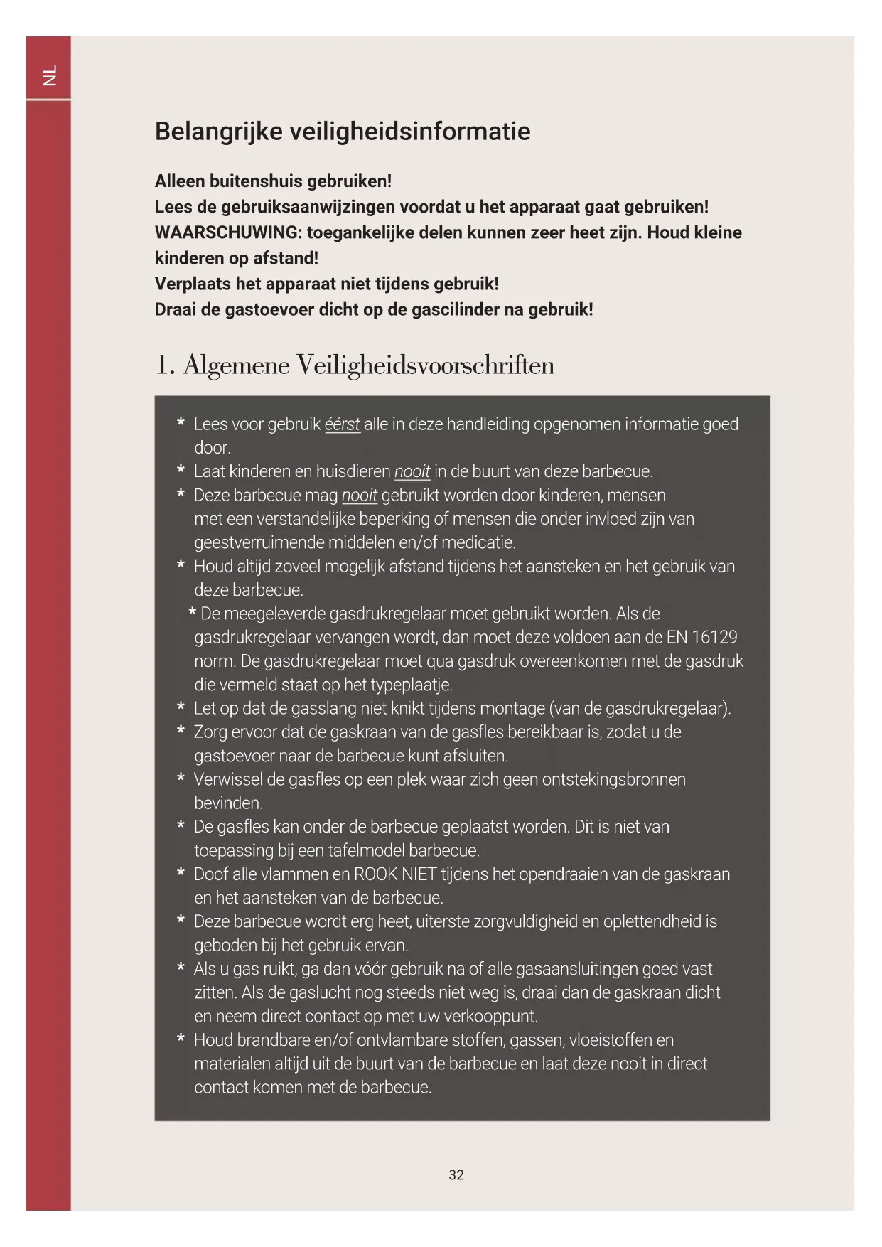 - Deze barbecue mag nooit gebruikt worden door kinderen, mensen met een verstandelijke beperking of mensen die onder invloed zijn van geestverruimende middelen en/of medicatie.