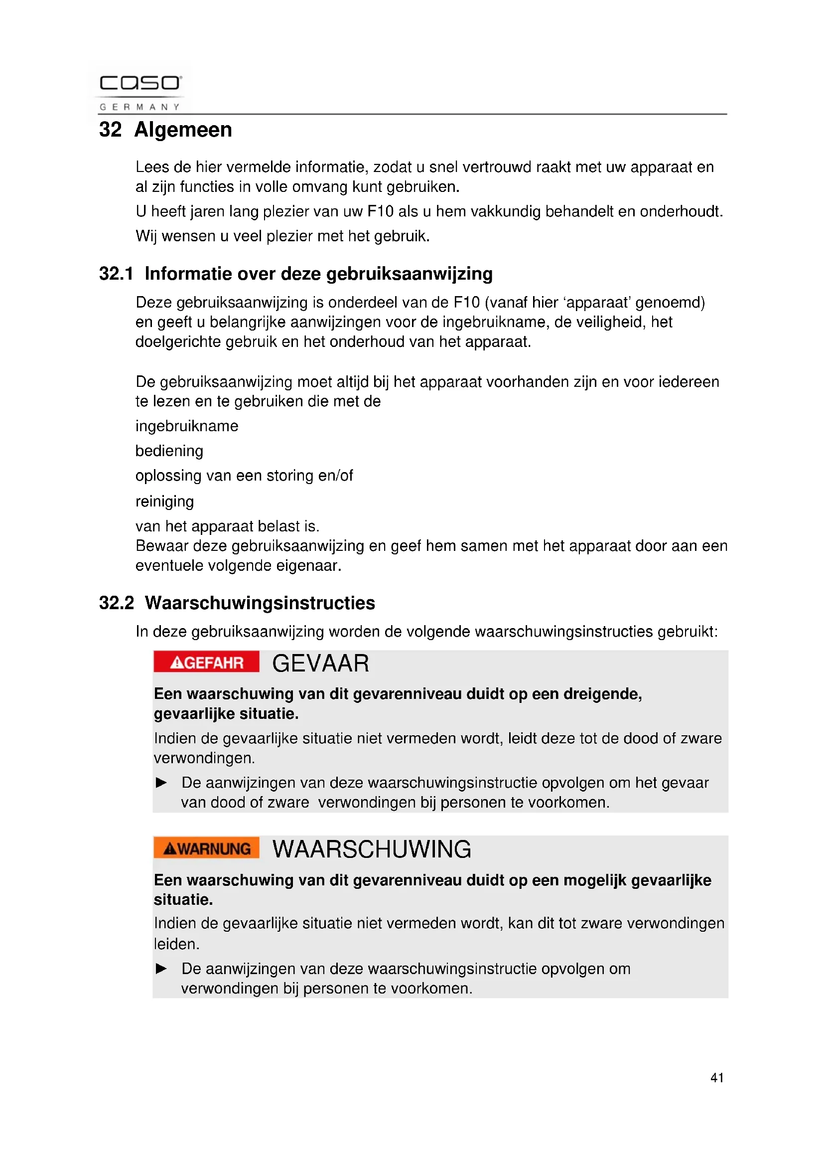 Deze gebruiksaanwijzing is onderdeel van de F10 (vanaf hier ‘apparaat’ genoemd) en geeft u belangrijke aanwijzingen voor de ingebruikname, de veiligheid, het doelgerichte gebruik en het onderhoud van het apparaat. De gebruiksaanwijzing moet altijd bij het apparaat voorhanden zijn en voor iedereen te lezen en te gebruiken die met de ingebruikname bediening oplossing van een storing en/of reiniging van het apparaat belast is. Bewaar deze gebruiksaanwijzing en geef hem samen met het apparaat door aan een eventuele volgende eigenaar.