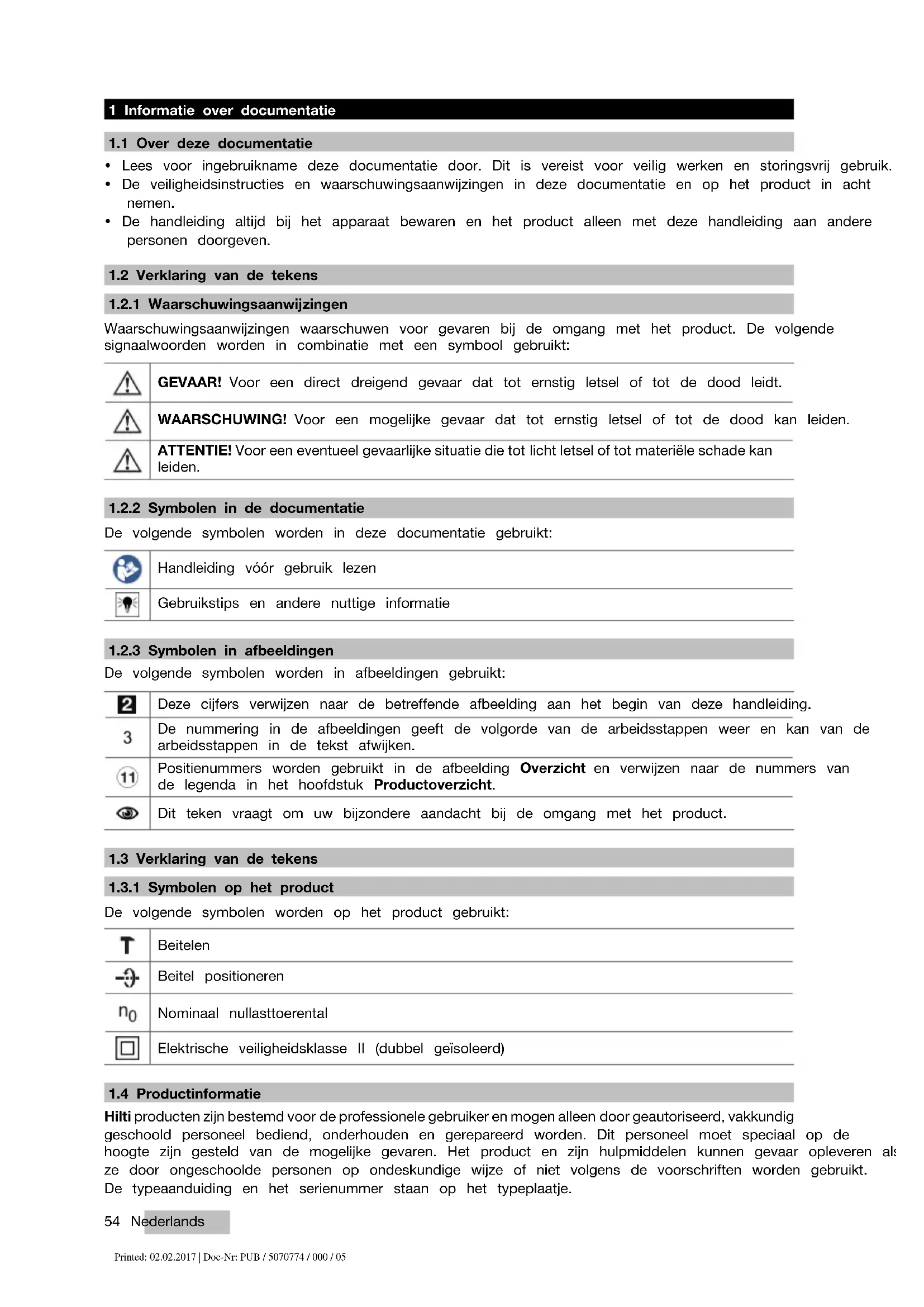 Als de uitsluitend verantwoordelijken voor dit product verklaren wij dat het voldoet aan de geldende voorschriften en normen. Een afbeelding van de Conformiteitsverklaring vindt u aan het einde van deze documentatie. De technische documentatie is hier te vinden: Hilti Entwicklungsgesellschaft mbH | Zulassung Geräte | Hiltistraße 6 | 86916 Kaufering, DE 2 Veiligheid