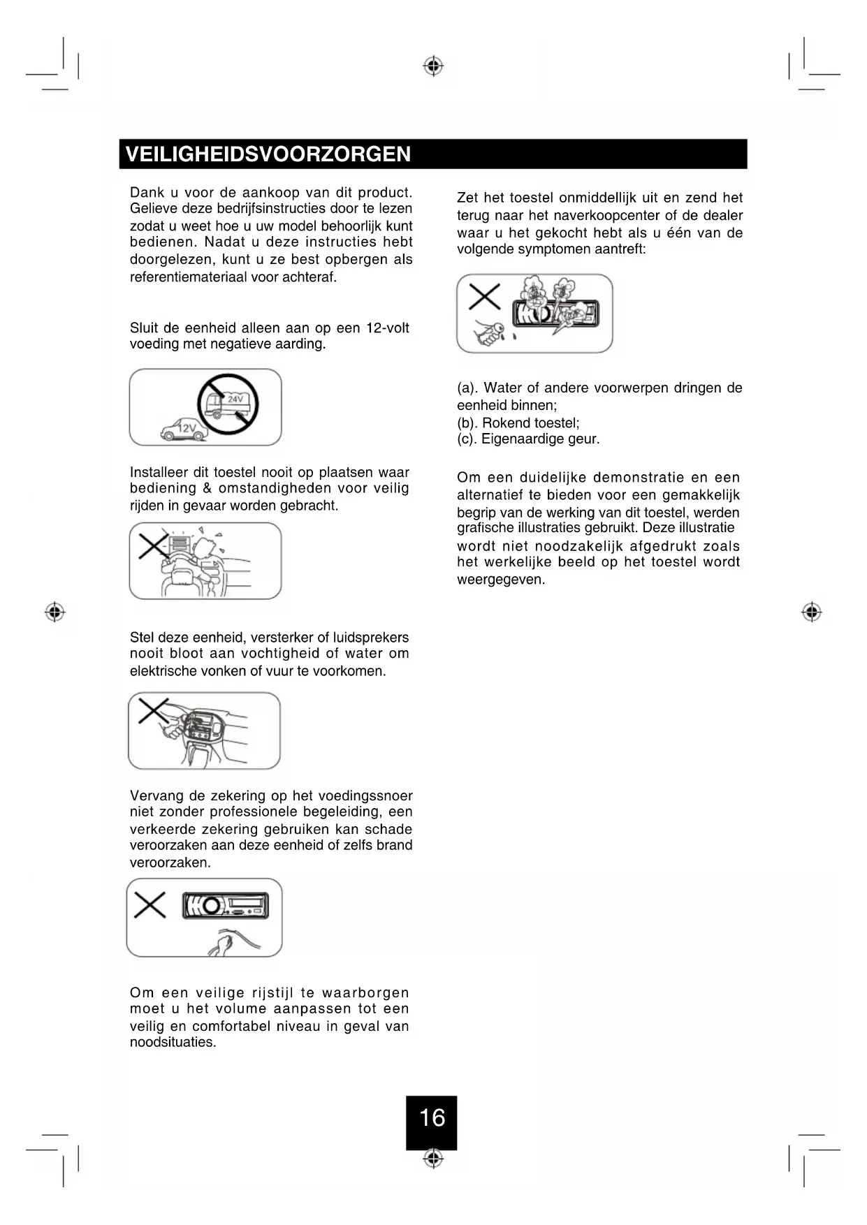 Als u niet zeker bent hoe dit toestel correct te installeren, neem dan contact op met een ervaren technicus. MontagehulsHoofdeen-heidAfwerking splaatVerwijder de twee schroevenMontageboutRubber buffer30 PROBLEMEN VERHELPEN De volgende checklist kan u helpen bepaalde problemen op te lossen die u ondervindt bij gebruik van dit toestel. Vooraleer deze te raadplegen, de aansluitingen controleren en de instructies in de gebruikerhandleiding opvolgen. Gebruik het toestel niet in abnormale toestand, bijvoorbeeld zonder geluid, of bij rook of verdachte geur die tot brand of elektrische schok kunnen leiden. Stop het gebruik en bel naar de winkeel waar u het toestel gekocht hebt. Probleem Mogelijke oorzaak Oplossing Algemeen Het toestel start niet. Auto-ontsteking niet aan. Kabel niet goed aangesloten. Zekering doorgebrand. Verdraai autosleutel in contact. Controleer kabelaansluiting. Vervang zekering door nieuwe met zelfde capaciteit. Geen geluid. Volume staat op minimum of dempingsfunctie is aan. Controleer het volume of zet de dempingsfunctie uit. Het toestel of scherm werkt niet normaal. Het toestelsysteem is instabiel. Druk op de RESET-knop. DISC-modus Het toestel spelt geen disks af. De disk is verkeerd ingezet. De disk is vuil of beschadigd. Disk moet worden ingezet met label naar boven. Maak de disk schoon en controleer op schade. Probeer andere disks. Geluid springt over door trillingen. Montagehoek meer dan 30˚. Montage is instabiel. Verstel montagehoek tot minder dan 30˚. Monteer toestel stevig met meegeleverde hulpstukken. TUNER-modus Zenders worden niet ontvangen. De antenne is niet correct aangesloten. Sluit de antenne correct aan. Slechte kwaliteit ontvangst radiozender. Antenne niet volledig uitgetrokken of gebroken. Trek de antenne volledig uit en vervang ze indien gebroken. Voorkeuzezenders zijn verloren. De batterijkabel is niet correct aangesloten. Sluit permanente stroomdraad op het toestel aan op de permanente stroomdraad van het voertuig. USB/SD/MMC-modus USB/SD-toestel kan niet worden ingezet . Het USB/SD-toestel werd verkeerd ingezet. Zet het toestel andersom in. Het USB/SD-toestel kan niet worden gelezen. NTFS-formaat is niet ondersteund. Controleer of het USB/SD- bestandssysteem in FAT of FAT32 – formaat is. Door verschillende formaten kunnen sommige modellen USB- opslagtoestellen of MP3-spelers niet worden gelezen.31 SPECIFICATIES Algemeen Voeding: 12VDC (11V-16V), Test voltage 14.4V, negative ground Maximum uitgangsvermogen: 50W x 4 channels Continu uitgangsvermogen: 20W x 4 channels (4 10% T.H.D.) Geschikte luidsprekerimpedantie: 4-8ohm Voorversterkeruitgangsspanning: 2.0V (Play mode: 1KHz, 0dB, 10K load) Zekering: 15A Afmetingens (WxHxD): 188 x 58 x 163mm Gewicht: 1.7kg Aux-in niveau: 500mV FM Stereo Radio Frequentiebereik: 87.5-108.0MHz Bruikbare gevoeligheid: 8dBμ Frequentiekarakteristiek: 30Hz-15KHz Stereoscheiding: 30dB(1KHz) Beeldreactieverhouding: 50dB IF-reactieverhouding: 70dB Signaal/ruisverhouding: >55dB AM(MW)-radio Frequentiekarakteristiek 522-1620KHz Bruikbare gevoeligheid (S/N=20dB) 30dBμ Components Montagehuls 1 Machineschroeven M5x6 mm 4 Draadconnector 1 Trimplaat 1 Uitneemsleutel 2 Bedieningsinstructies 1 Nota: Specificaties en het ontwerp zijn onderworpen aan aanpassingen zonder voorafgaande kennisgeving door technologische verbeteringen.32 SAFETY PRECAUTIONS To ensure safe driving, please adjust the volume to a safe & comfort level in case of emergency situations. Never expose this unit, amplifier, and speakers to moisture or water for preventing electric sparks or res. Please don't change the fuse on the power cord without professional guidance, using improper fuse may cause damage to this unit or even cause re. Please power off this unit at once and send it back to the after-sales service center or the dealer/distributor you purchased from if one of the following symptoms is found: (a). Water or other obstacle enters the unit; (b). Smoking; (c). Peculiar smell. Only connect the unit to a 12-volt power supply with negative grounding. Never install this unit where the operation & condition for safety driving is restrained. Thank you for purchasing this product. Please read through these operating instructions so you will know how to operate your model properly. After you have nished reading the instructions, keep this manual in a safe place for future reference. To provide a clear demonstration and an alternative for easy understanding of the operation of this unit, graphic illustration was used. However, this illustration is not necessary printed as the actual image found on the unit.33 WMA and MP3 Compatibility It is possible to playback WMA and MP3 les. About WMA The unit can playback WMA data. Windows Media and the Windows logo are trade marks or registered trademarks of Microsoft Corporation in the United States and/or other countries. This unit may not operate correctly depending on the application used to encode WMA les. About MP3 Supply of this product only conveys a license for private, non-commercial use and does not convey a license nor imply any right to use this product in any commercial (i.e.revenue- generating) realtime broadcasting (terrestrial, satellite, cable and/or any other media), broad- casting/streaming via internet, intranets and/or other networks or in other electronic content distribution systems, such as pay-audio or audio-on-demand applications. An independent license for such use is required. For details, please visit http://www.mp3licensing.com. FEATURES34 PANEL CONTROLS Power ON: Press [ /MUTE] button to turn on the unit.